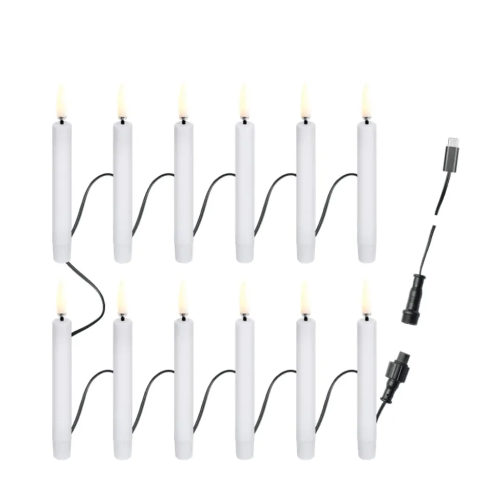 Die Christmas String Candles von verbinden die klassische Weihnachtsstimmung mit moderner Technik und zeitloser Ästhetik. Mit ihren warmen, flackernden LED-Lichtern und der naturgetreuen Wachsoberfläche schaffen sie eine gemütliche und authentische Atmosphäre, ohne dass Kerzenlicht benötigt wird. Die filigrane Lichterkette trägt zehn schlanke Lichterkronen, die elegant auf einem grünen Draht verteilt sind und sich mühelos in die Zweige des Weihnachtsbaums einfügen. Alles lässt sich ganz einfach per Fernbedienung und Zeitschaltuhr steuern, was das Erlebnis sicher und bequem macht.