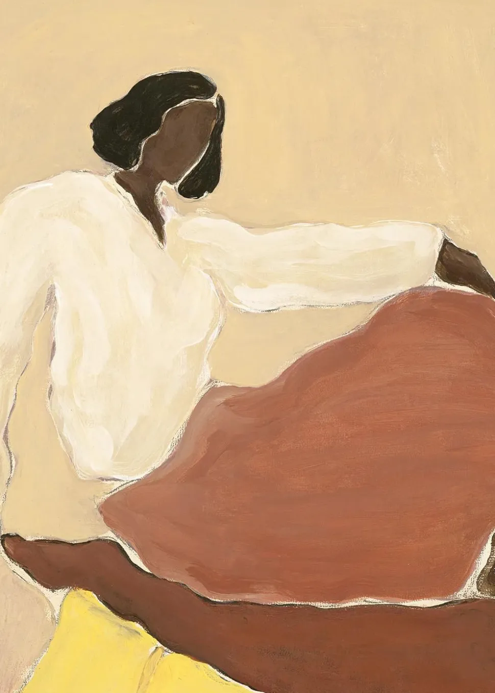Chronicles 01″ von , geschaffen von Sacrée Frangine, ist eine Interpretation einfacher Alltagsmomente, die in poetische Kompositionen verwandelt werden. Dieses Werk stellt eine unbewegte Figur in den Mittelpunkt, die von Rostfarben und pastellfarbenem Pfirsich umgeben ist, wobei ein Hauch von Zitronengelb ein lebendiges Element hinzufügt. Die einfachen Formen werden durch reiche Pinselstriche hervorgehoben, die die Bewegung der Farbe auf der Leinwand einfangen und ein Gefühl von Ruhe und Dynamik vermitteln.
