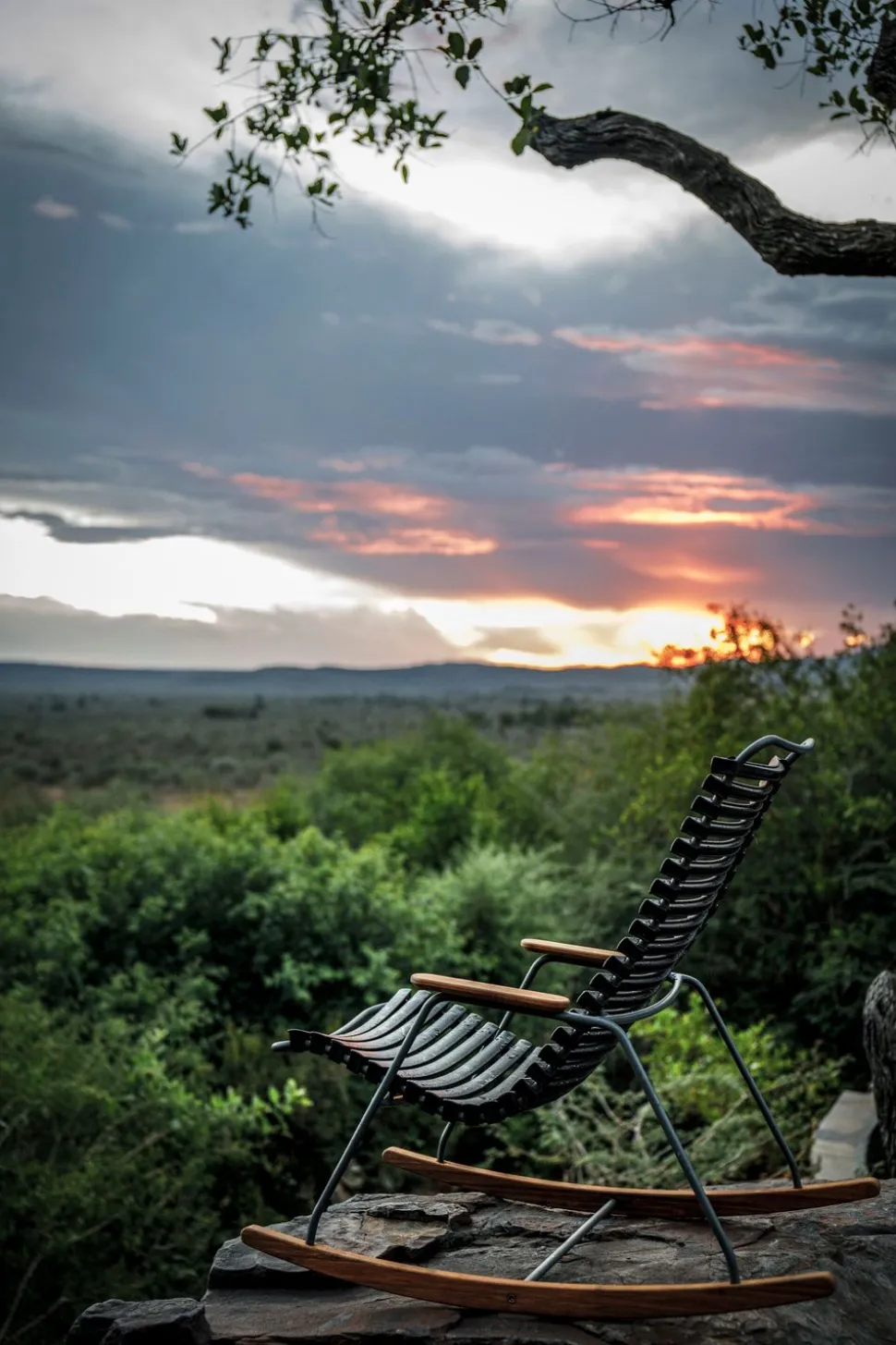 - Materialien: Gestell: Pulverbeschichteter grauer Stahl; Sitz: Kunststofflamellen; Armlehnen und Kufen: Bambus.