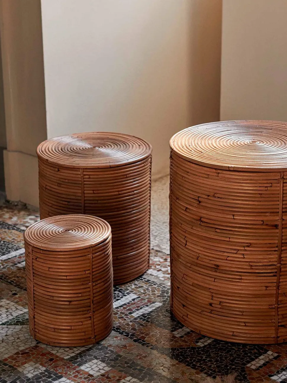 Die schöne Column Storage von ist ein perfektes Beispiel dafür, wie funktionales Design aussehen kann. Die Boxen sind aus Rattan gefertigt und in verschiedenen Höhen erhältlich, sodass sie gestapelt oder einzeln verwendet werden können. Sie sind ideal, um alles zu organisieren, von Büchern und Zeitschriften bis hin zu Kleidung und Accessoires, und ihr schlichtes und stilvolles Design passt zu jeder Einrichtung.