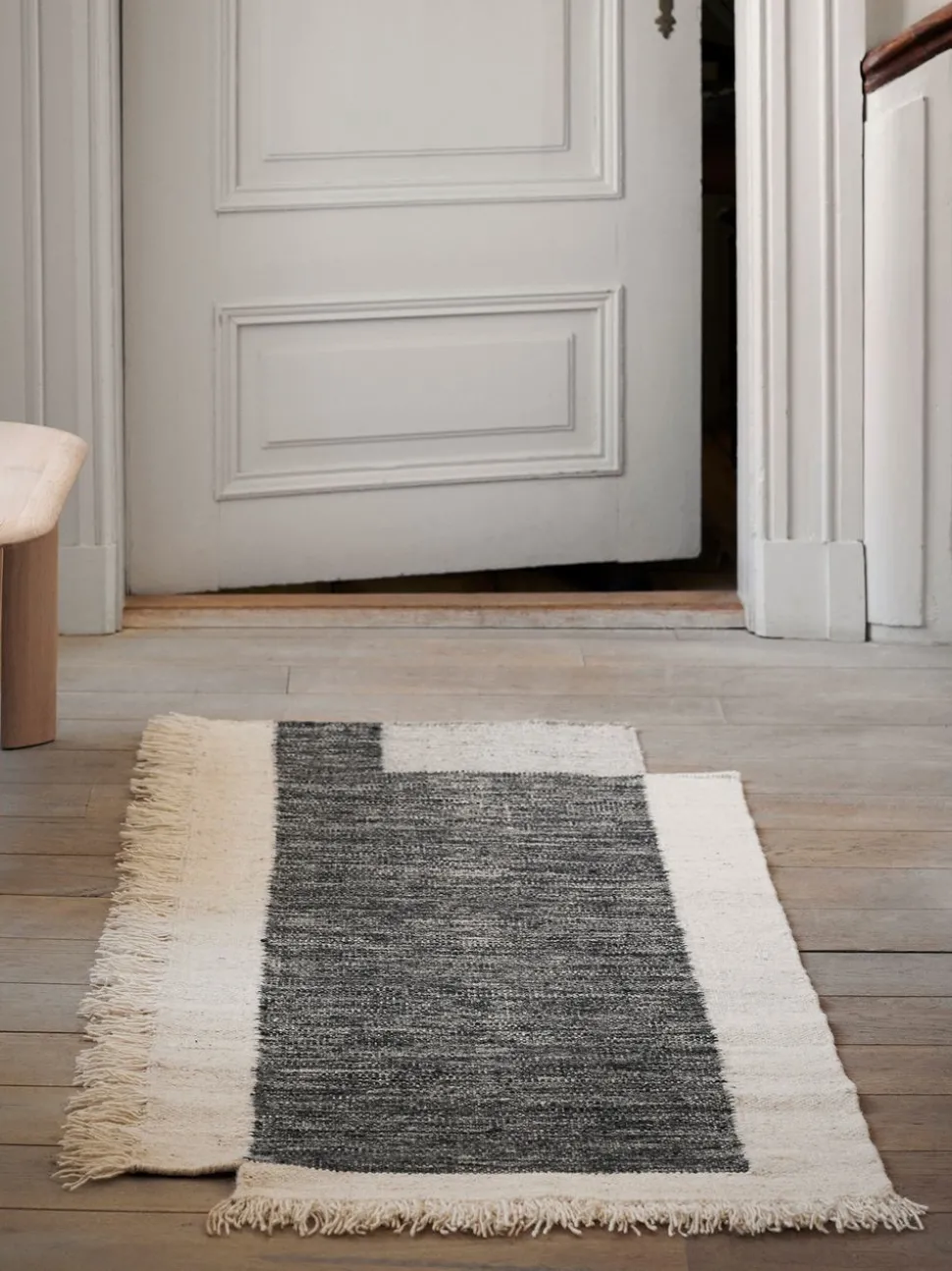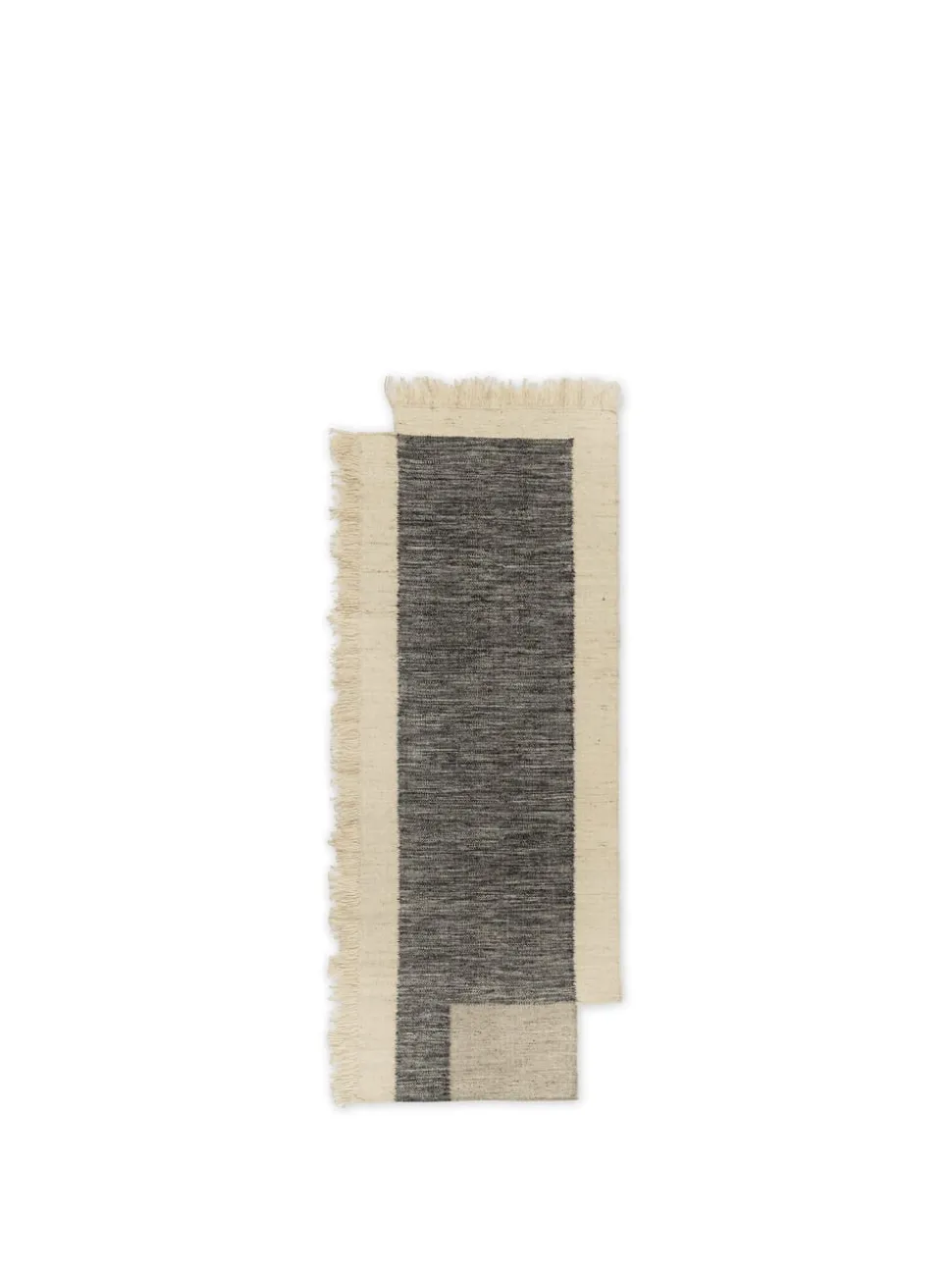 Schöner handgewebter Läufer mit einem faszinierenden asymmetrischen Design mit sich überschneidenden geometrischen Formen, die mühelos ineinander übergehen und so strukturierte Farbabschnitte bilden.
