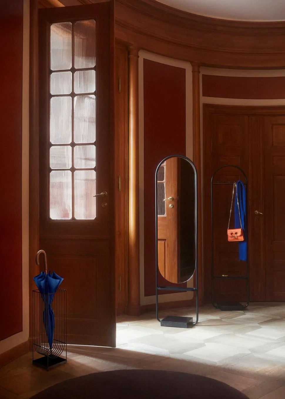 CURVA-Schirmständer von Danish im bekannten Design mit den glänzenden Metallstäben, geformt zu Funktionsmöbeln und Interieur. Der Schirmhalter ist eine einfache und raffinierte Art, Schirme im Eingangsbereich zu verstauen, wo er nicht nur zur Ordnung beiträgt, sondern auch ein schönes Möbelstück an sich ist.