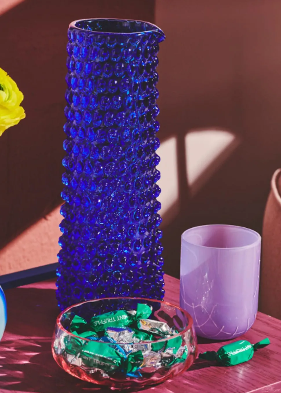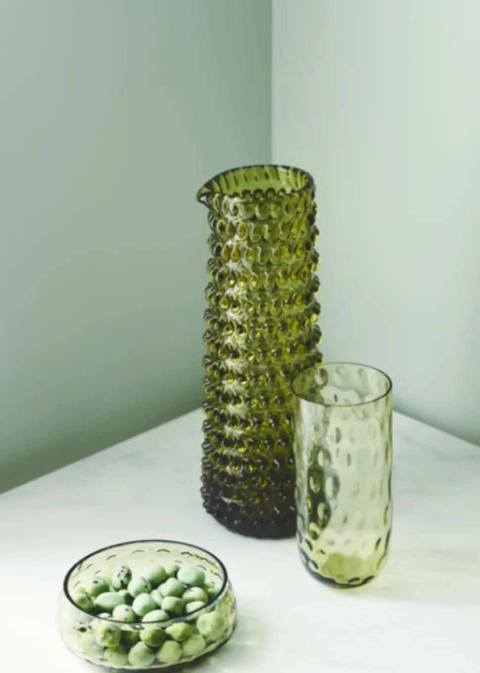 Schöne Karaffe, die vom regnerischen dänischen Sommer inspiriert wurde. Dies ist an der Struktur des Glases zu erkennen, denn es ist so gestaltet, dass es aussieht, als ob viele Regentropfen auf der Karaffe liegen. Die Karaffe wird aus hochwertigem Glas aus Böhmen, Tschechien, mundgeblasen. Verwenden Sie diese Karaffe das ganze Jahr über als Dekanter, aber Sie können sie auch als Vase mit schönen Blumen für Ihren gedeckten Tisch verwenden. HINWEIS: Alle Karaffen sind mundgeblasen, was bedeutet, dass es leichte Abweichungen in Farbe und Form gibt, die Sie jedoch nicht bemerken werden.