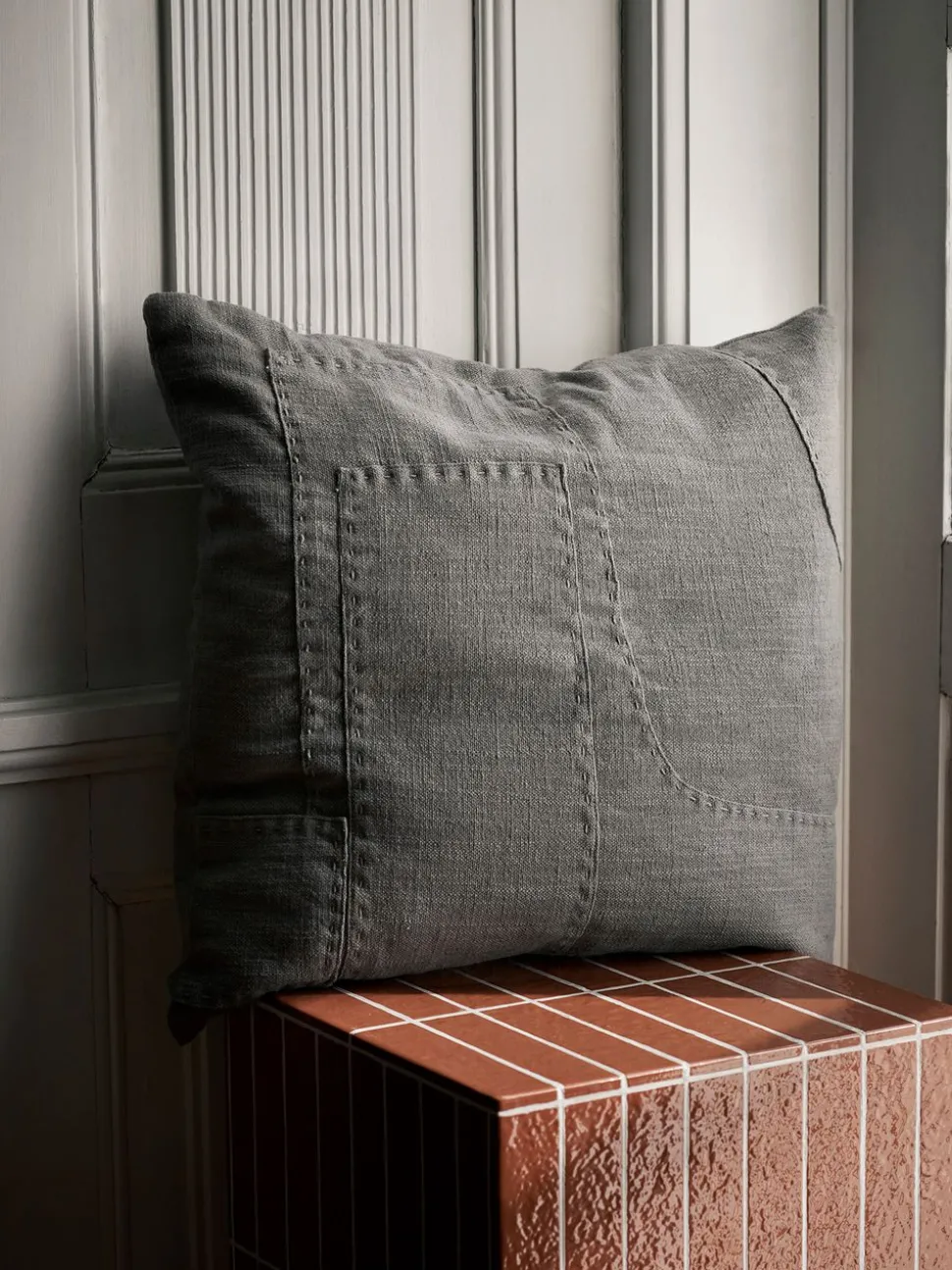 Die wunderschönen Darn-Kissen von ferm living sind in Zusammenarbeit mit der Künstlerin Leise Dich Abrahamsen entstanden. Die Kissen zeigen monochrome, geschichtete Patchwork-Details und übergroße Handnähte.