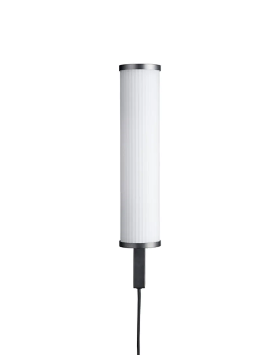 Deco Wandleuchte von Norr11. Die Deco-Lampe ist Teil der Deco-Kollektion. Die Deco-Kollektion hat ihren Ursprung in den zylindrischen Wandleuchten, die in den Lobbys und Eingangshallen von Art-Déco-Gebäuden der 1930er Jahre zu finden waren. Die Deco-Kollektion besteht aus einem sehr minimalistischen und vereinfachten Lampendesign. Das Design dieser Leuchte basiert auf einem zylindrischen Schirm aus Opalglas. Der durchscheinende Glasschirm zeichnet sich durch eine gerippte Textur aus, die der Beleuchtung ein schimmerndes und dekoratives Detail verleiht. Die Deco-Kollektionen sind als verschiedene Lampen erhältlich.