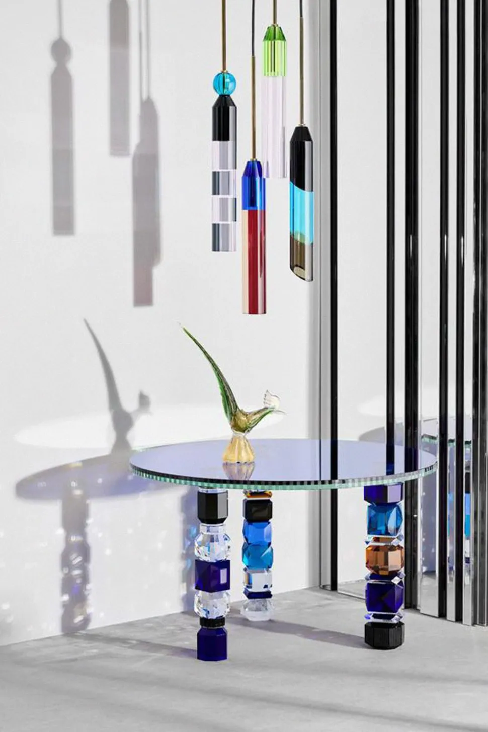 Der Detroit-Tisch von kombiniert moderne Trends mit Details und Materialien, die vom Glam-Art-Dekorstil inspiriert sind. Eine einfache Glasplatte mit sauberen, scharfen Kanten ruht auf Teetischbeinen, die aus Säulen aus farbigem Kristallglas in geometrischen Formen bestehen. Der ästhetische Ausdruck und das skulpturale Design des Tisches sorgen für Aufmerksamkeit in jedem Raum und verleihen jedem Dekor eine exklusive Note.