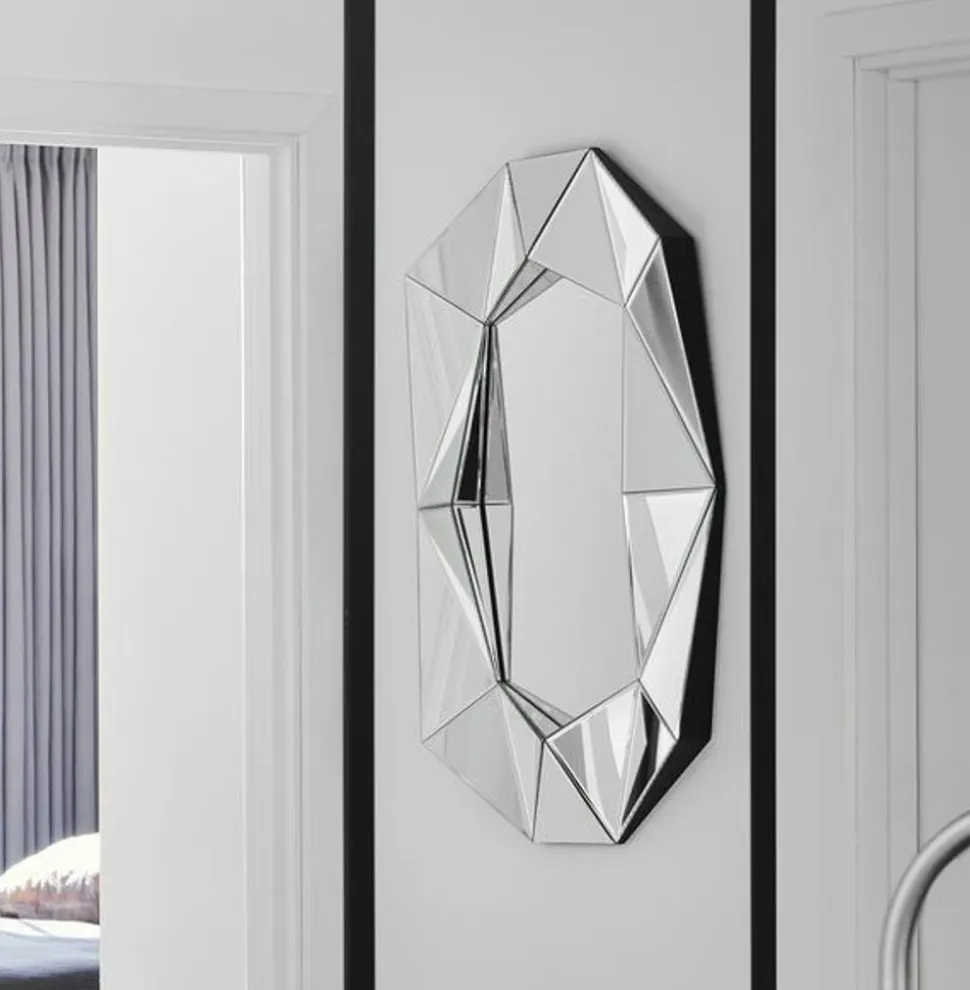 Diamond Mirror ist eines der charakteristischsten Interieurstücke von , eher mit seinem auffälligen glamourösen Design, das aus einem eckigen Spiegelrahmen aus wunderschön gefärbtem Spiegelglas besteht. Der Spiegel ist in drei Größen erhältlich, die sich jeweils unterschiedlich gut in die Wohnung einfügen; der kleinere Spiegel eignet sich perfekt sowohl im Badezimmer als auch im Flur, und der große Ganzkörperspiegel ist in der Garderobe unverzichtbar.