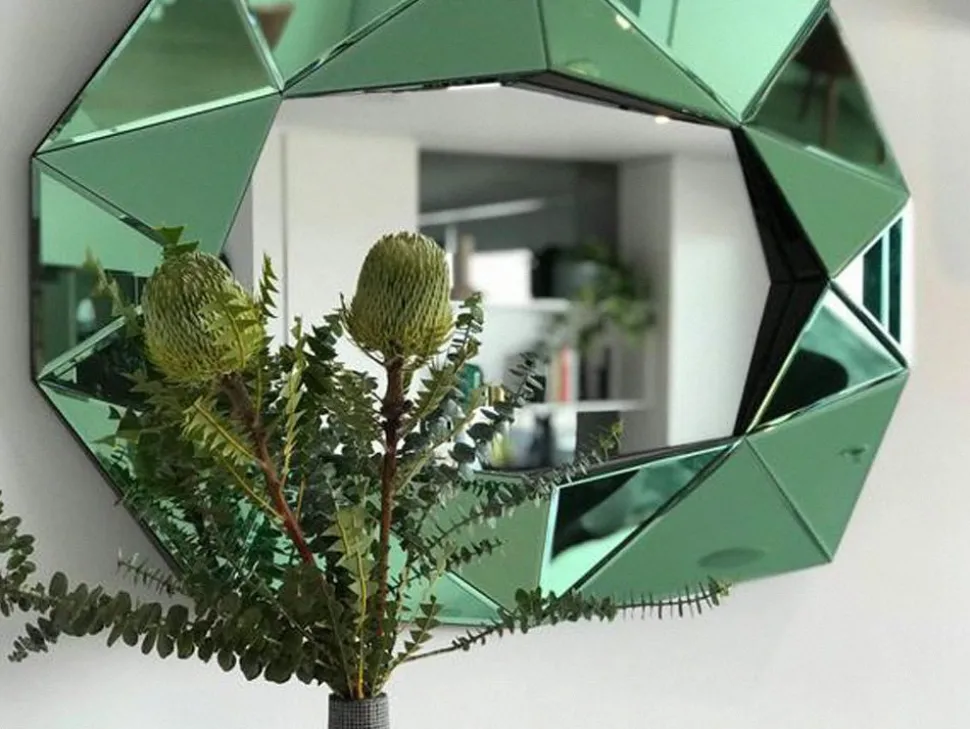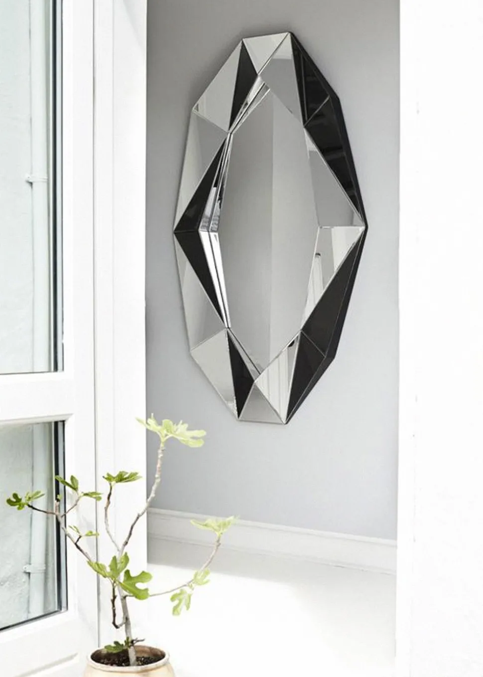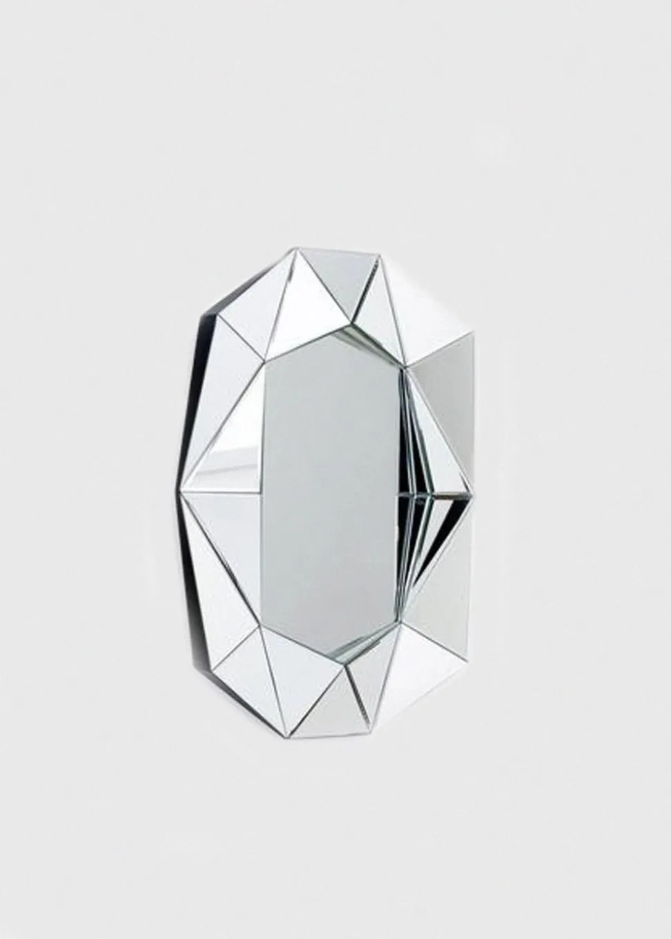 Diamond Mirror ist eines der charakteristischsten Interieurstücke von , eher mit seinem auffälligen glamourösen Design, das aus einem eckigen Spiegelrahmen aus wunderschön gefärbtem Spiegelglas besteht. Der Spiegel ist in drei Größen erhältlich, die sich jeweils unterschiedlich gut in die Wohnung einfügen; der kleinere Spiegel eignet sich perfekt sowohl im Badezimmer als auch im Flur, und der große Ganzkörperspiegel ist in der Garderobe unverzichtbar.