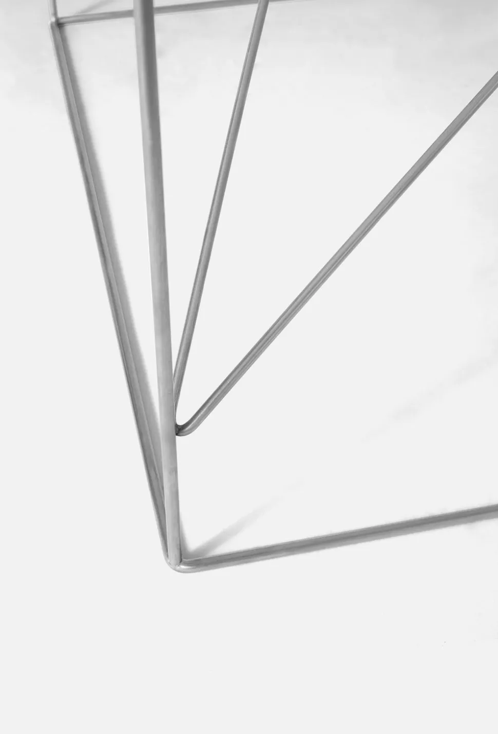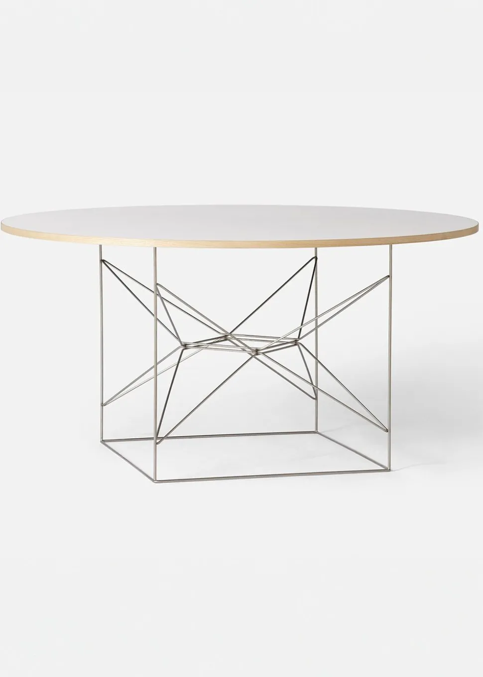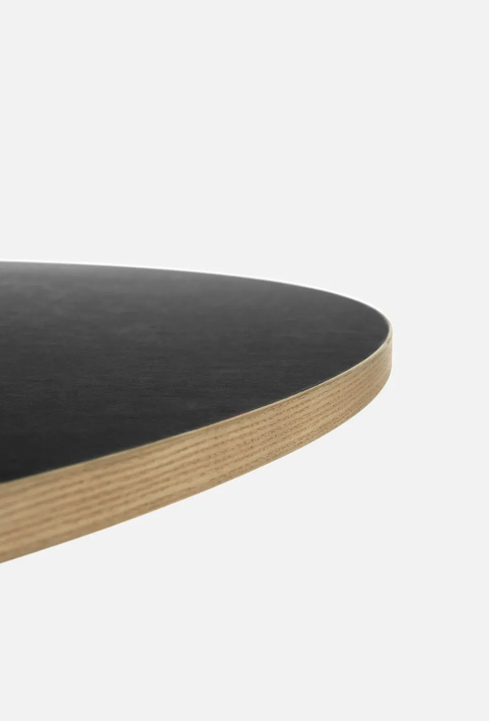 - Gestell aus rostfreiem Stahl. Wendbare Tischplatte aus schwarzem Linoleum und weißem Laminat. Kante in Esche.