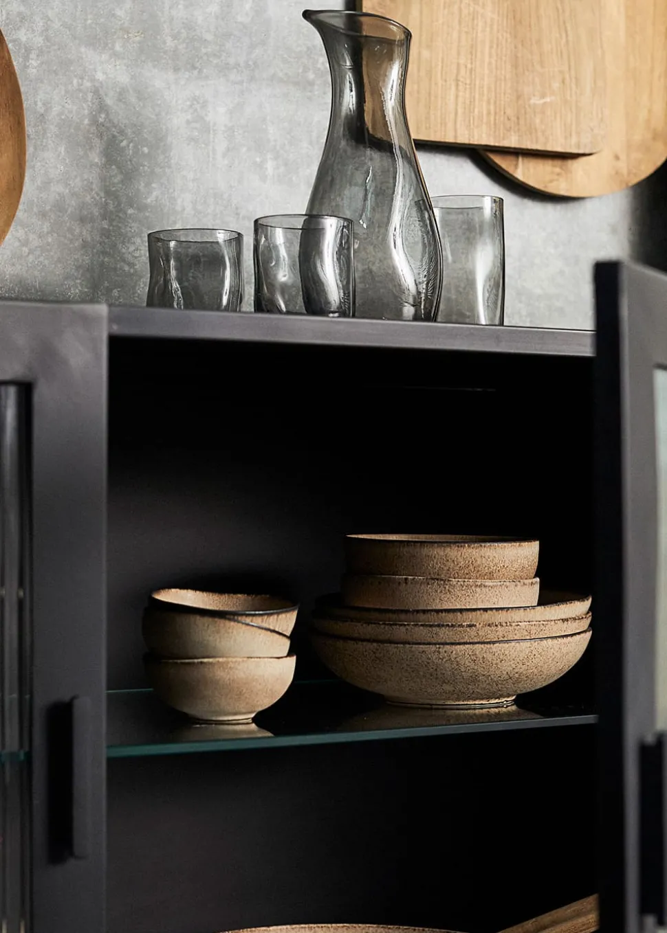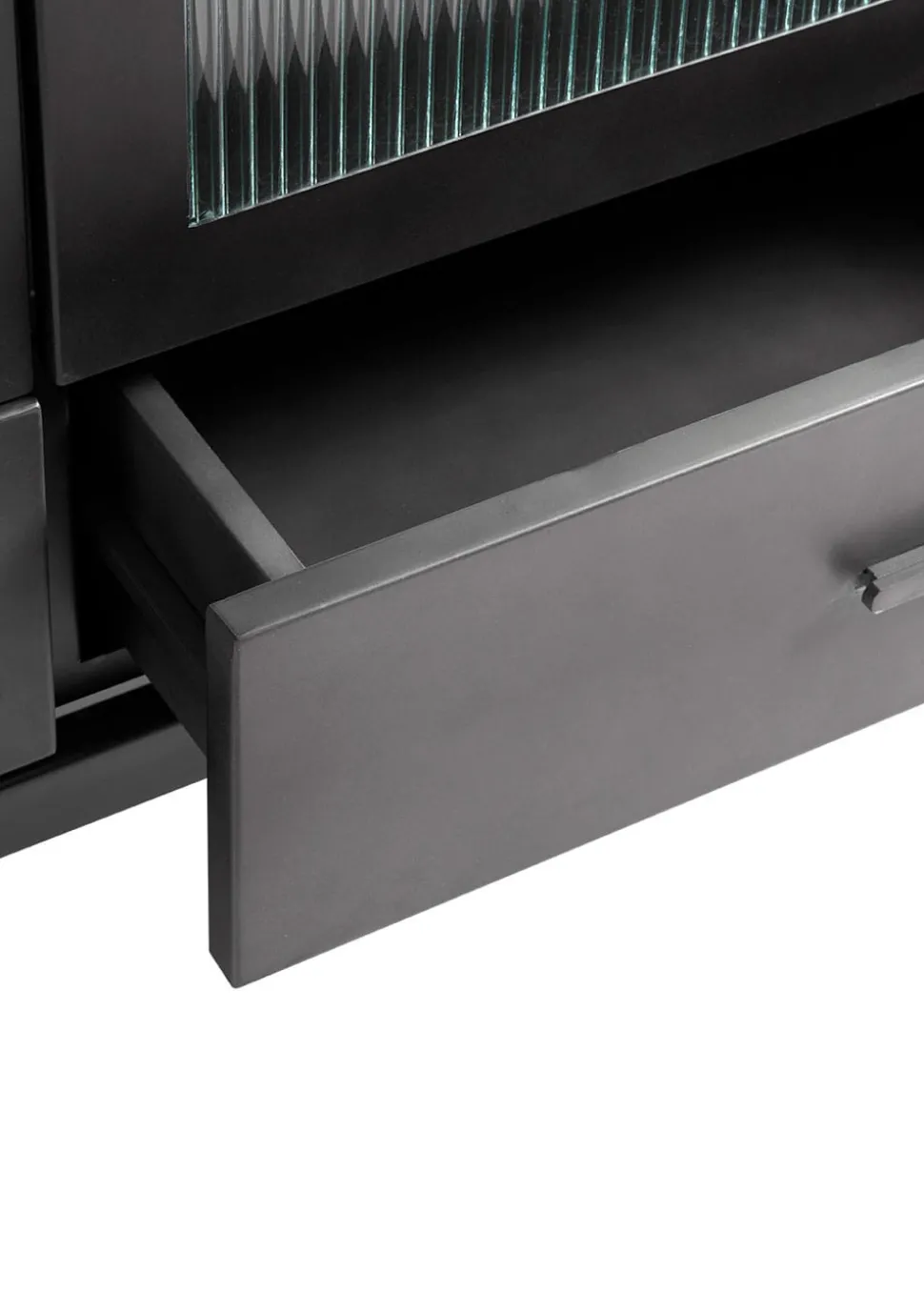 Die Vitrine Dallas von Muubs ist eine Verschmelzung von robuster Eleganz und Funktionalität, die für ein modernes Zuhause mit einer Vorliebe für urbane Ästhetik entworfen wurde. Die Besonderheit dieses Möbelstücks ist das geriffelte Glas an den Vordertüren, das für ein ausgeprägtes visuelles Interesse sorgt und gleichzeitig für eine ruhige und geordnete Atmosphäre im Raum sorgt. Der Schrank ist mit praktischen Schubladen im unteren Bereich ausgestattet, die sich ideal für die Aufbewahrung kleinerer Gegenstände eignen, sowie mit einem Glasboden im Inneren, der Ihre Lieblingsstücke elegant präsentiert. Der magnetische Schließmechanismus unterstreicht die Benutzerfreundlichkeit des Schranks und sorgt für eine einfache und effiziente Handhabung.