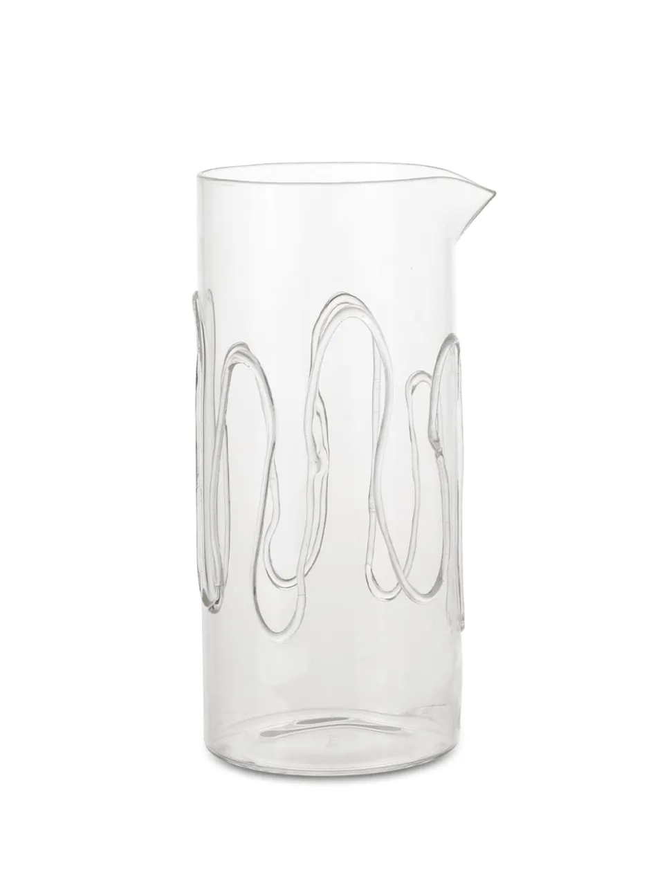 Wunderschöne mundgeblasene Karaffe von ferm living. Die Karaffe Doodle ist eine kunstvolle Ergänzung für jede Glassammlung, denn jedes Stück weist ein anderes, einzigartiges Muster auf. Die unverwechselbaren Wellenmuster der Karaffe aus Borosilikatglas werden von einem erfahrenen Glasmeister mit einer Fackel hergestellt, sodass kein Stück dem anderen gleicht.