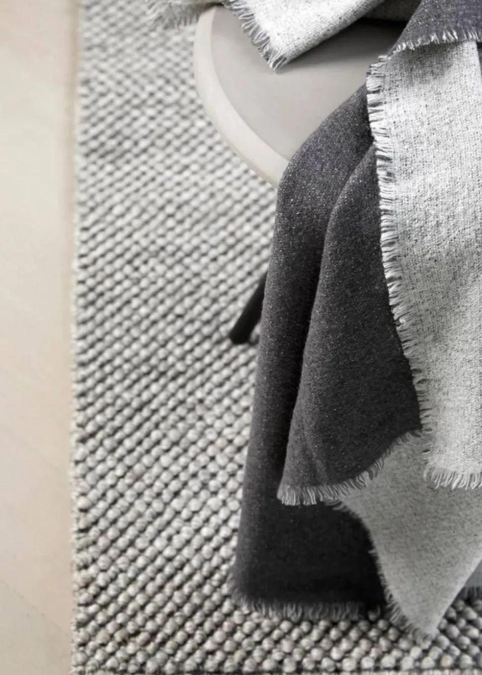 Double Throw von ist ein ästhetischer Teppich mit minimalistischen Details. Der Teppich ist ideal für die kälteren Monate – denn er ist als Doppelgewebe aus Merinowolle gewebt.