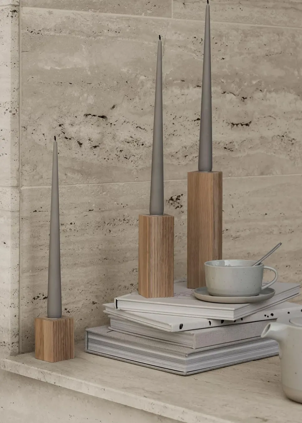 Der Dreva-Kerzenhalter von verbindet zeitlose Eleganz mit natürlichen Materialien in einem schlichten, schönen Design. Er wird aus FSC-zertifizierter Eiche in drei Größen hergestellt, die jeweils mit feinen, polierten Rillen versehen sind, die die warmen Töne des Holzes betonen. Der Kerzenständer ist für schlanke Kerzen gedacht und verleiht jedem Raum mit seinem ruhigen und harmonischen Ausdruck eine gemütliche Atmosphäre.