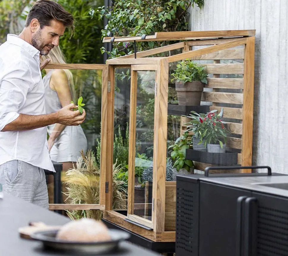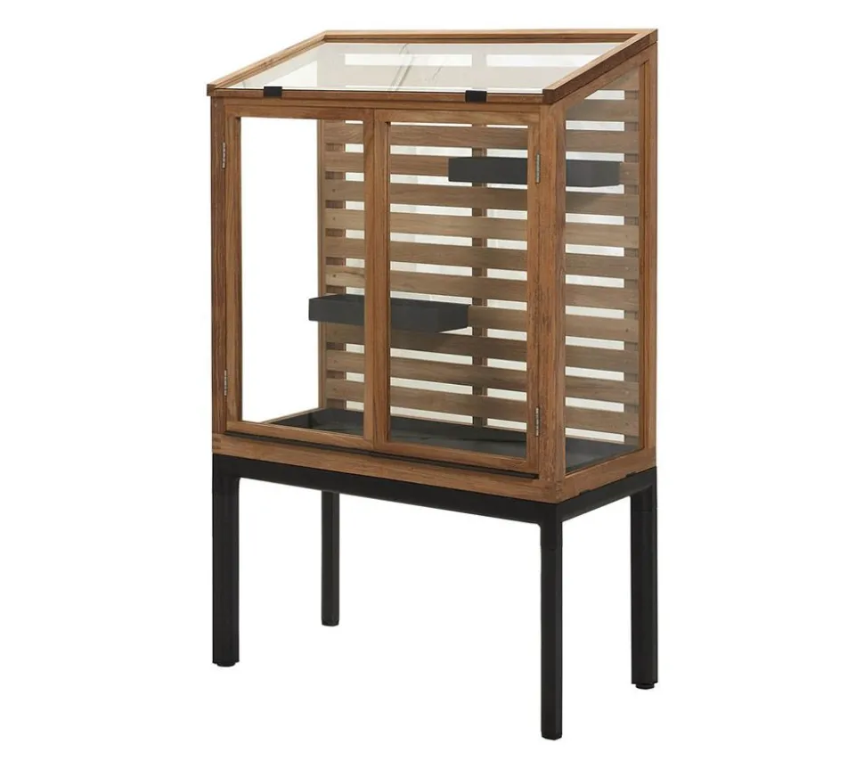 Drop Greenhouse ist ein Entwurf von . Die Drop-Serie besteht aus verschiedenen Outdoor-Möbeln. Das Gewächshaus ist aus Teakholz mit Glasscheiben und zwei Türen hergestellt. Dies macht es einfach, das Gemüse und die Kräuter im Haus zu organisieren. Zum Drop-Gewächshaus gehören zwei herausnehmbare Regale. Die Oberseite lässt sich leicht öffnen und zusammendrücken, wodurch eine Luftzirkulation geschaffen und optimale Wachstumsbedingungen gewährleistet werden können. Wenn Sie die ursprüngliche goldbraune Farbe des Teakholzes erhalten wollen, können Sie es mit Teak Care behandeln.