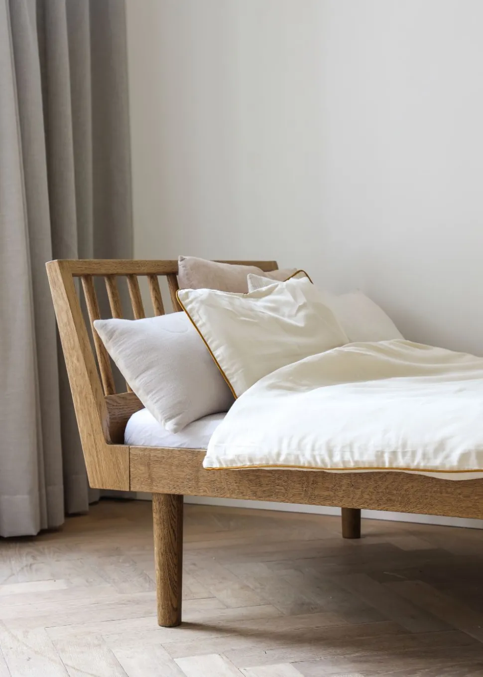 DasEli Combi Bett von ist eine elegante und stilvolle Ergänzung für jedes Schlafzimmer. Es hat ein minimalistisches und modernes Design mit klaren Linien und schönem Eichenholz, das perfekt zu jeder Einrichtung passt. Das hohe Kopfteil des Bettes sorgt für zusätzlichen Komfort und Halt, während das niedrige Fußteil ein offeneres Aussehen verleiht, das sich luftig und geräumig anfühlt.
