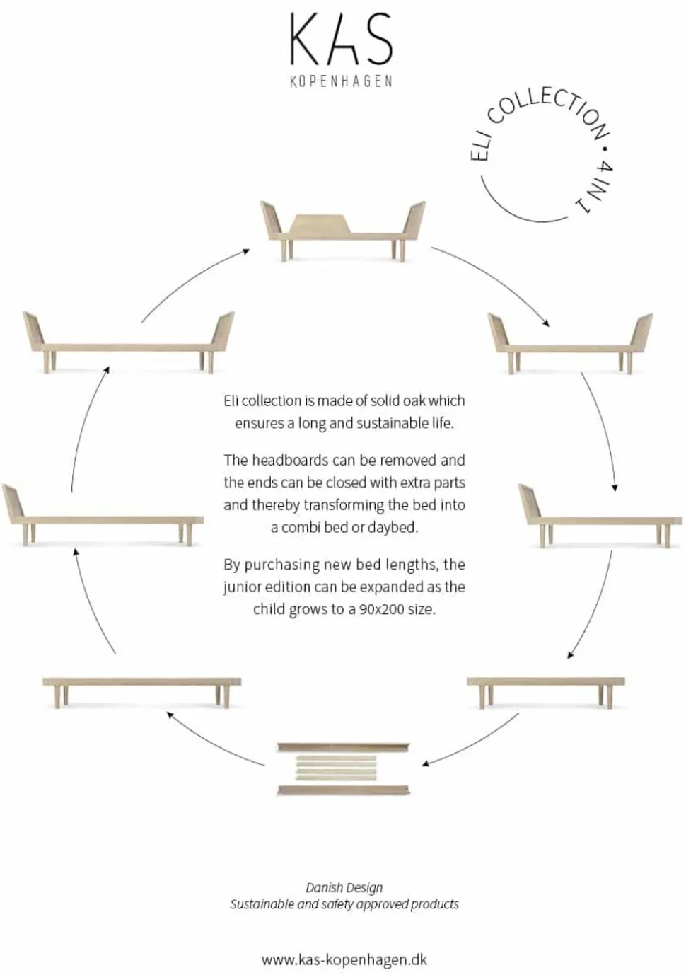 Wenn Sie das Bett später umbauen möchten, können Sie das Eli Combi in ein Daybed oder ein klassisches Eli-Bett verwandeln, indem Sie das Kopfteil entfernen und die Enden mit optionalen Teilen schließen.