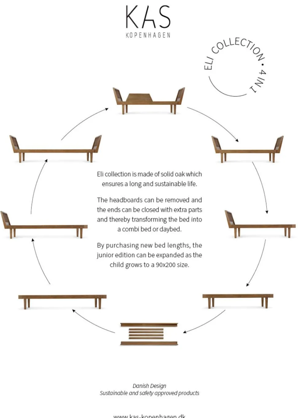 Das Eli DaybedJunior kann in das klassische Eli Juniorbett umgewandelt werden, indem man die geschlossenen Enden entfernt und Kopfteile hinzufügt. Wenn Sie es erweitern möchten, können Sie neue Längen kaufen und sie hinzufügen, wenn Ihr Kind wächst.