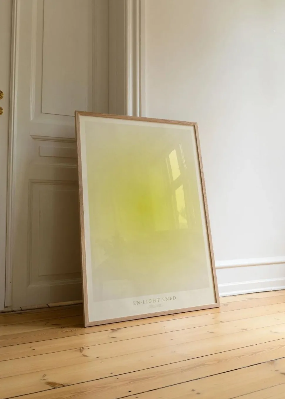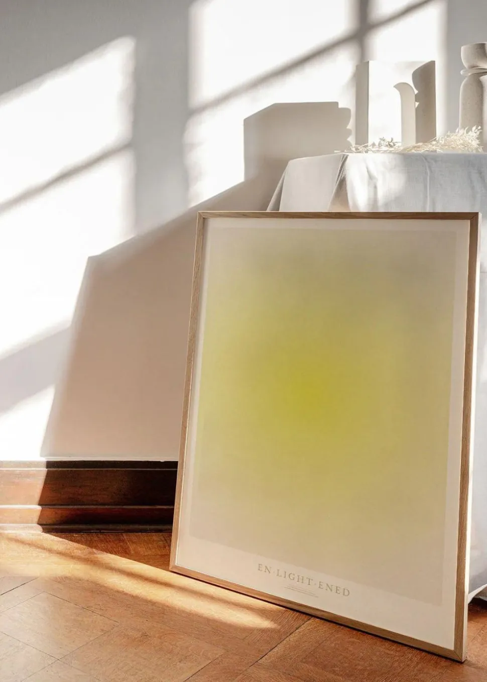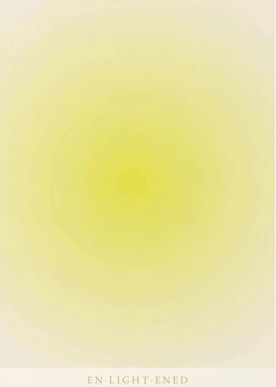 Enlightened wurde von dem Künstler Mie & Him entworfen. Das Plakat ist ein farbenfrohes grafisches Plakat, bei dem nicht ein Motiv, sondern ein Gefühl und ein Eindruck im Vordergrund stehen. Die auffällige gelbe Farbe, die langsam zum Rand hin abnimmt, zieht das Auge an und schafft ein Gefühl der Lebendigkeit.