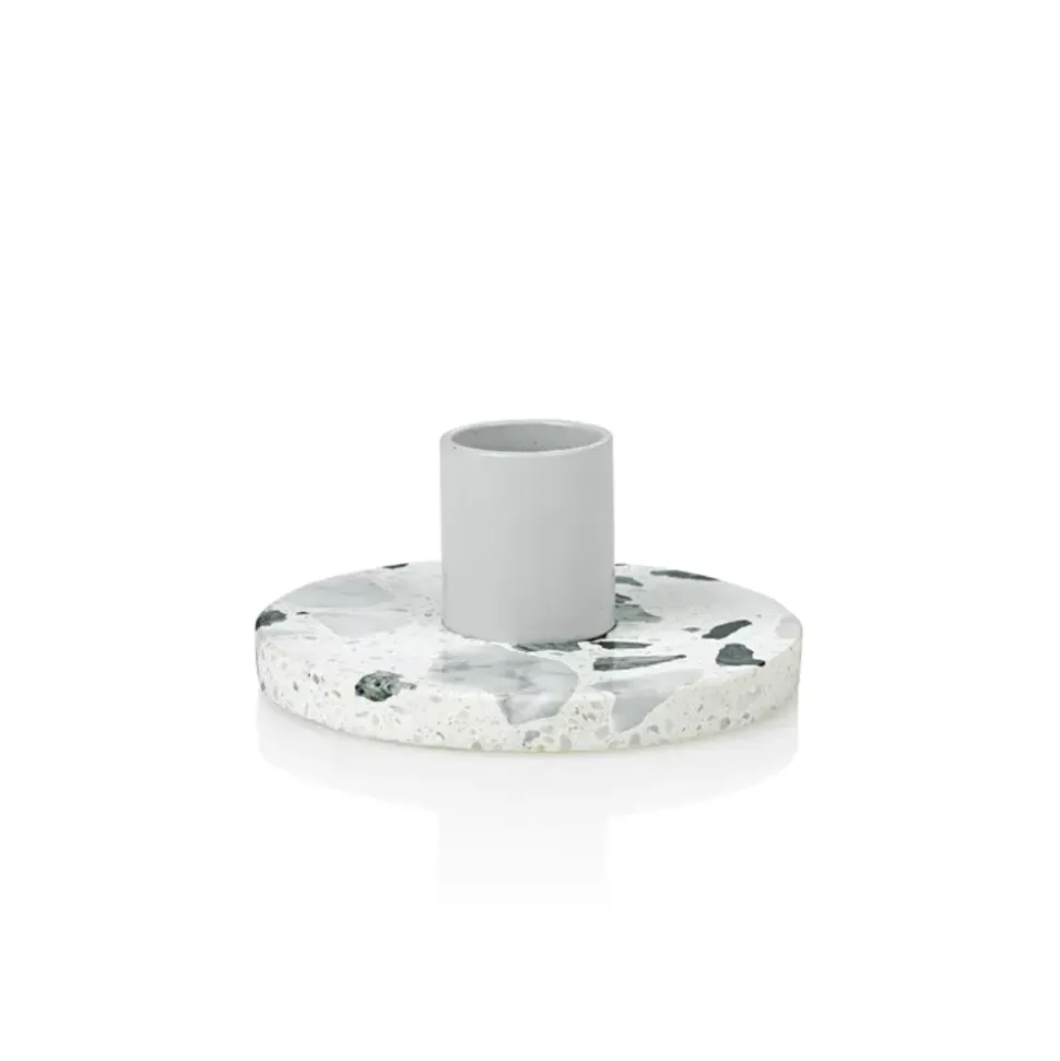 ERAT Kerzenständer von , entworfen von Alberto Bellamoli in einem italienischen Design, das auf die Funktionalität des Alltags trifft. Der Sockel des Leuchters besteht aus Terrazzo, einem Verbundmaterial, das aus Marmorstücken, Pigmenten und Marmorstaub zusammengefügt wird. Die in der Kollektion verwendeten Steine wurden von Alberto ausgewählt.