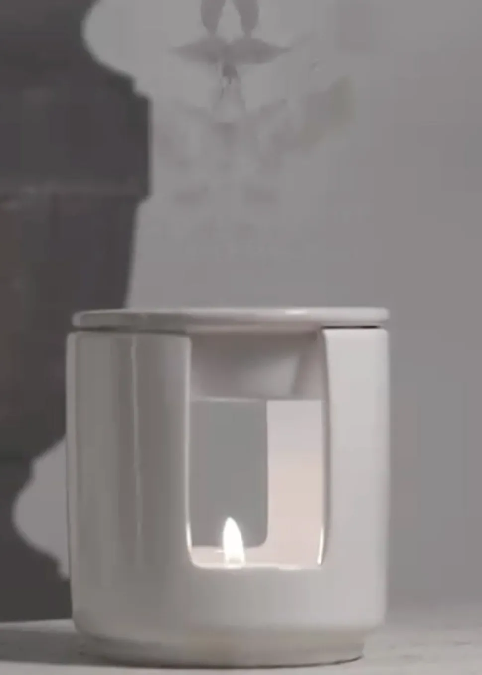 Die Essential Aroma Oil Lamp von ist ein wunderschönes Stück Porzellan mit einer glatten weißen Glasur.