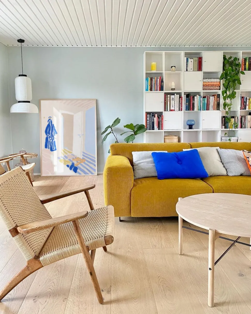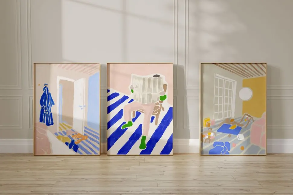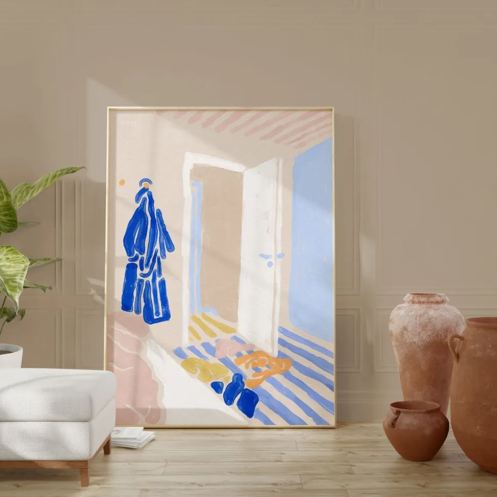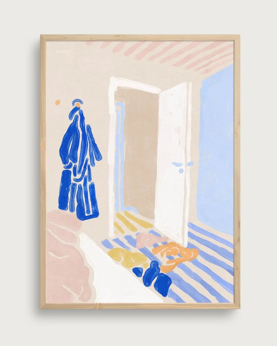 Ein Schlafzimmer“ ist ein Poster von Danish Taisho. Das Plakat zeigt ein ehrliches und rohes, ungesüßtes Zuhause, in dem die Wäsche auf dem Boden liegt, ein Morgenmantel auf dem Bügel und zerknittertes Bettzeug. Hier wird das Durcheinander zu etwas Schönem, da es in den richtigen Farben dargestellt wird.