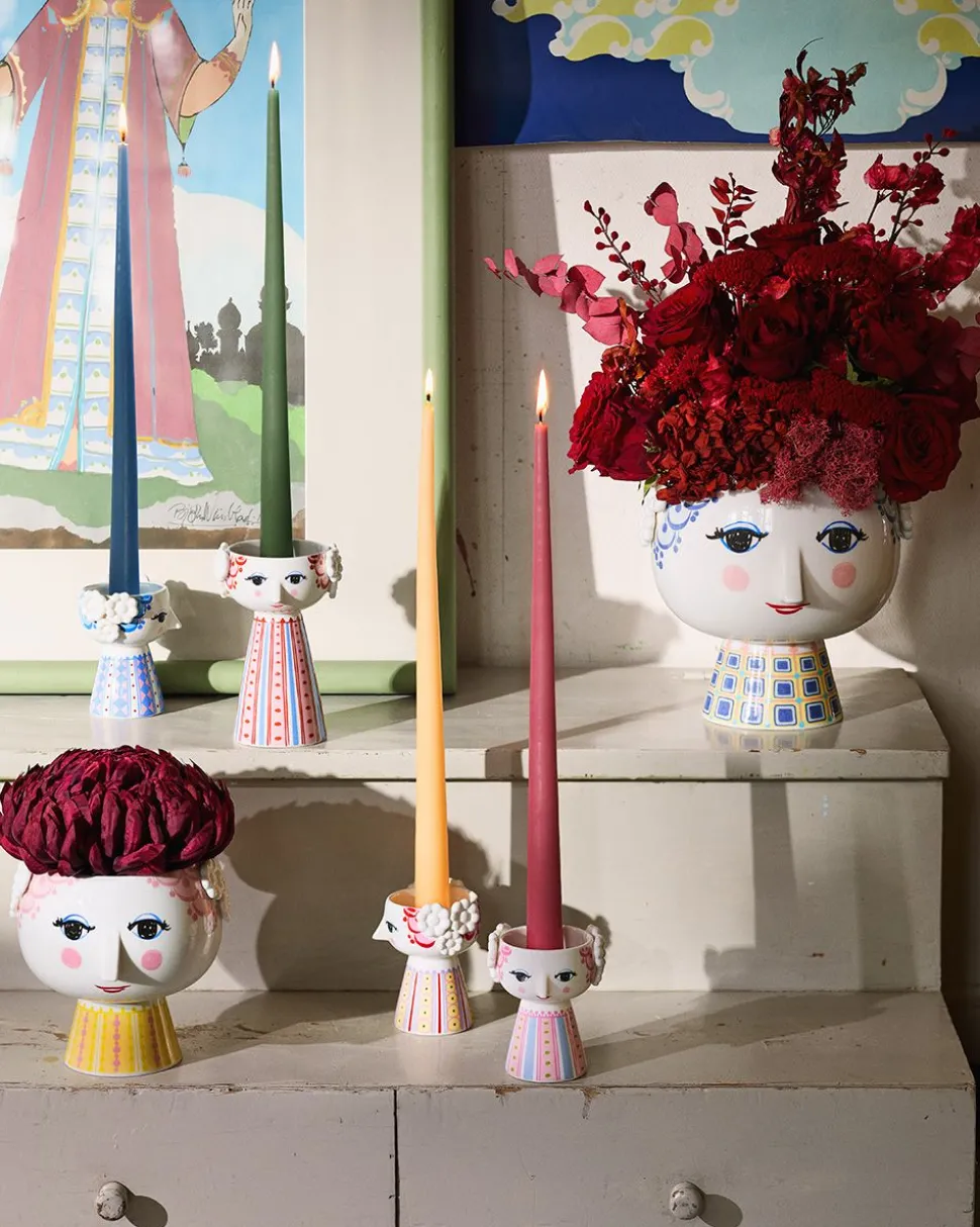 Der Eva-Kerzenhalter von ist ein lebendiges Kunstwerk, das Farbe und Licht in Ihr Zuhause bringt. Der von Wiinblad selbst entworfene Kerzenständer mit seinem charakteristischen Lächeln, den geröteten Wangen und den überschwänglichen Verzierungen fängt die Essenz seines fantasievollen Universums ein. Eva ist aus glasierter Keramik gefertigt und kombiniert einen verträumten Ausdruck mit einer harmonischen Mischung aus hellen Pastelltönen, die eine frische und lebendige Atmosphäre schaffen.