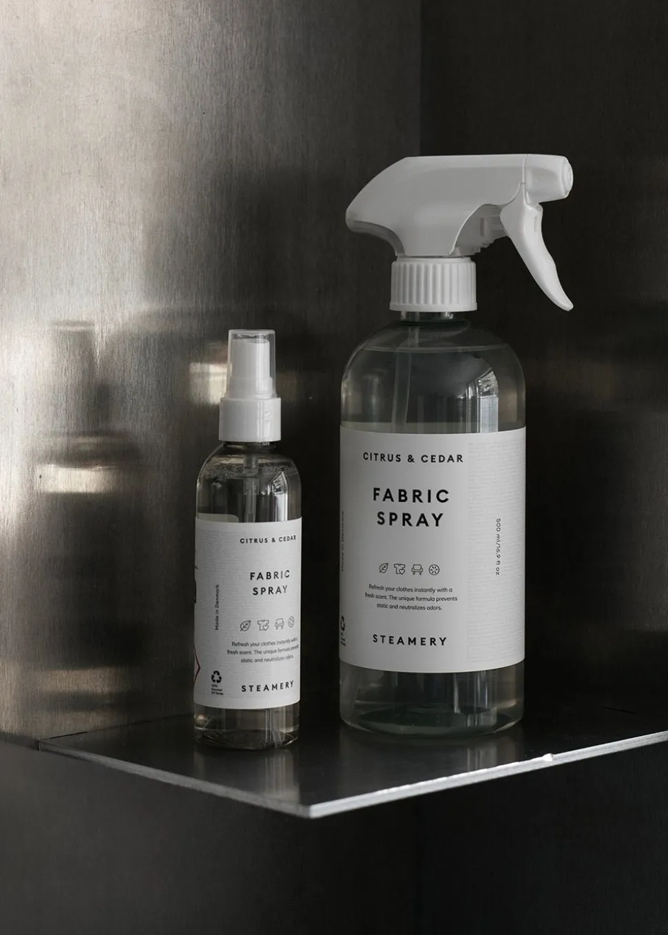 Das abbaubare Textilspray von Steamery verleiht Ihrer Kleidung und Ihren Heimtextilien einen sanften und anhaltenden Duft von Rose und Moschus. Eine einfache Methode, um Ihre Kleidung zwischen den Wäschen frisch zu halten.