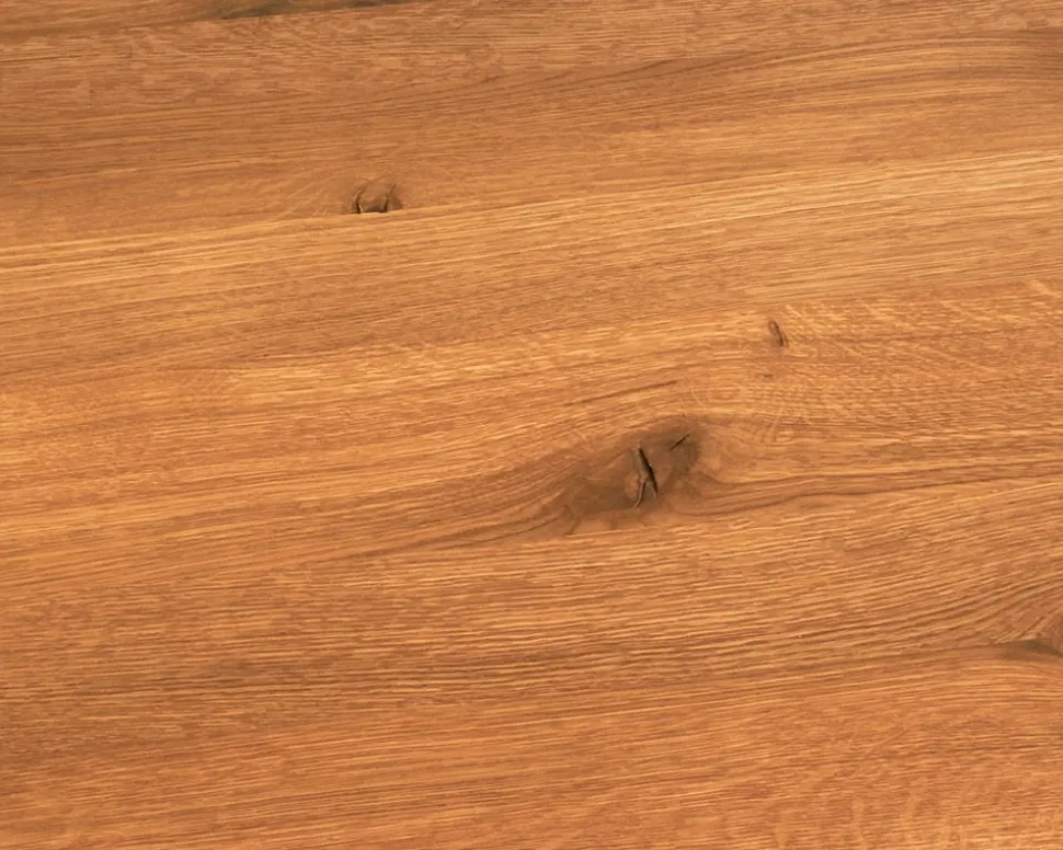 Esstisch auf dem Bauernhof, der ländliche Ästhetik ausstrahlt, kombiniert mit modernen nordischen Trends. Die rustikale Eiche mit Ästen verleiht der ansonsten schlichten Silhouette, die sich aus einer doppelseitigen Tischplatte, einer polierten und einer unpolierten Oberfläche sowie einem Gestell in traditioneller Bockbauweise, das die Tischplatte trägt, zusammensetzt, Charakter.