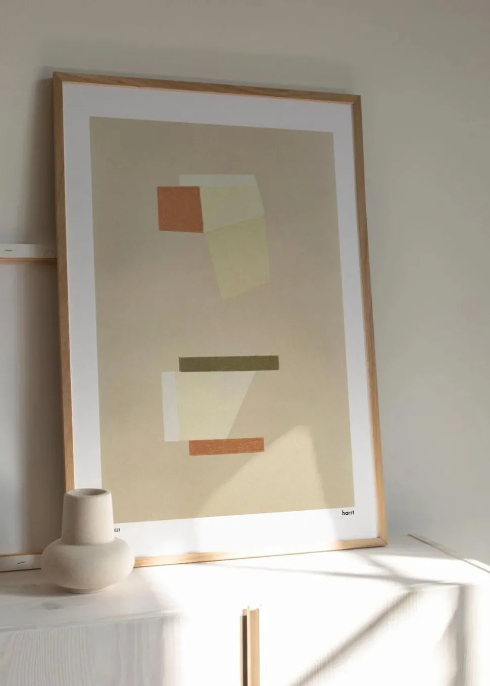 FIGURE#2 ist ein Entwurf von Hartt Studio. Das Plakat ist ein minimalistisches und modernes Plakat, das ein abstraktes Motiv aus verschiedenen Formen, Figuren und Linien zeigt. Die milde Farbpalette des Posters besteht aus Beige, Pastellgelb, Grün und Weiß. Sein einfaches Design ist daher als schöne Wanddekoration unverzichtbar.
