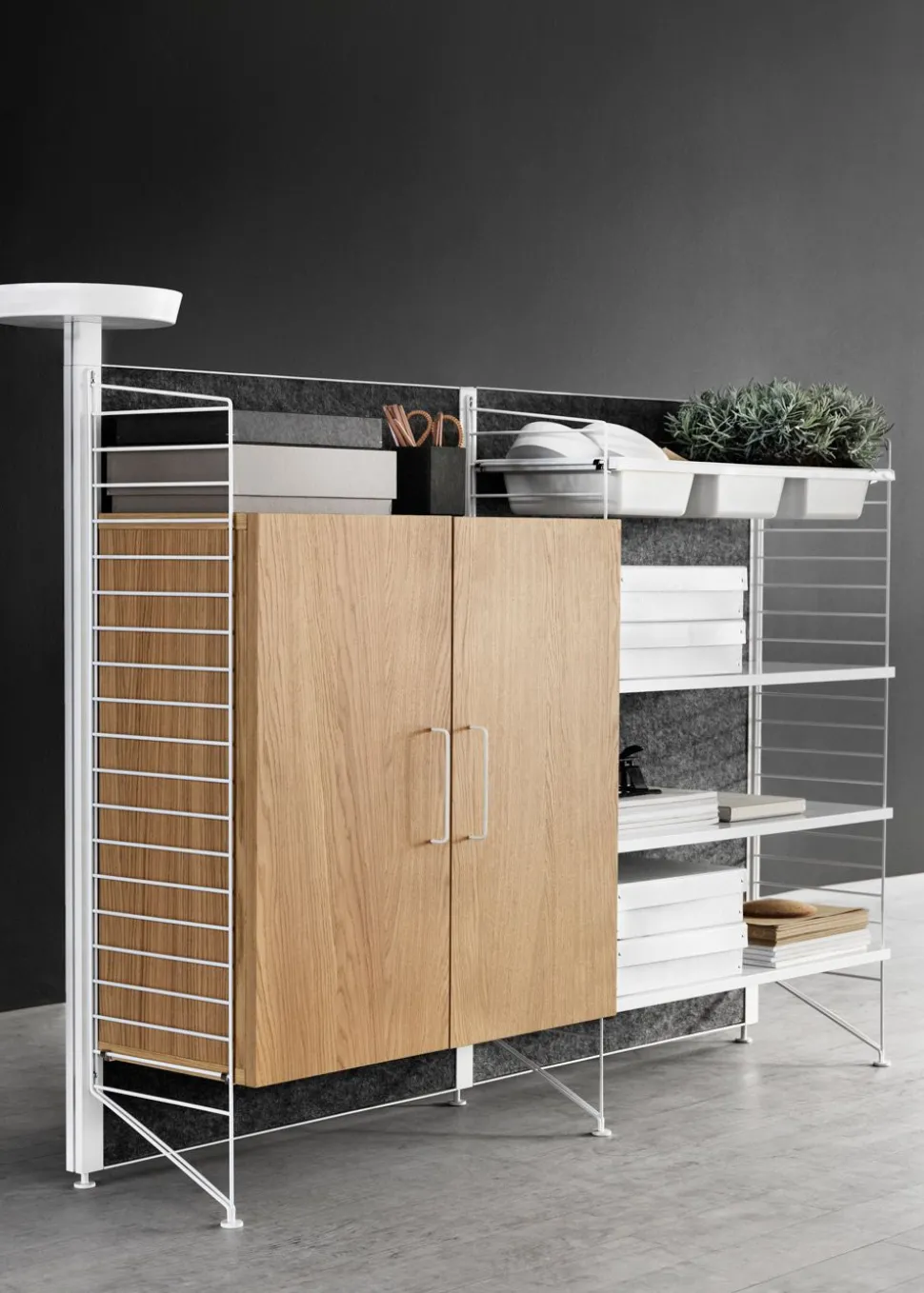 Der Aktenschrank ist Teil des String-Regalsystems, bei dem Funktionalität und Kundenanpassung im Vordergrund stehen. Das Regalsystem bietet unendliche Möglichkeiten für die Aufbewahrung und Kreativität, und mit einer großen Auswahl an Varianten, Farben und Materialien ist das String-Regalsystem der perfekte Weg, um Ihr eigenes Design zu kreieren. Die Serie besteht aus Boden-, Wand- und Flex-Paneelen, die eine Basis für Regale und Ablagen bilden. Es können Regale, Schränke, Bordüren, Zeitschriftenhalter und verschiedene Gadgets hinzugefügt werden. Das flexible System eignet sich perfekt für das moderne Zuhause, in dem einige wenige Elemente die Grundlage für die Inneneinrichtung des gesamten Hauses bilden können und sich leicht an den jeweiligen Raum anpassen lassen, egal für welchen Zweck.