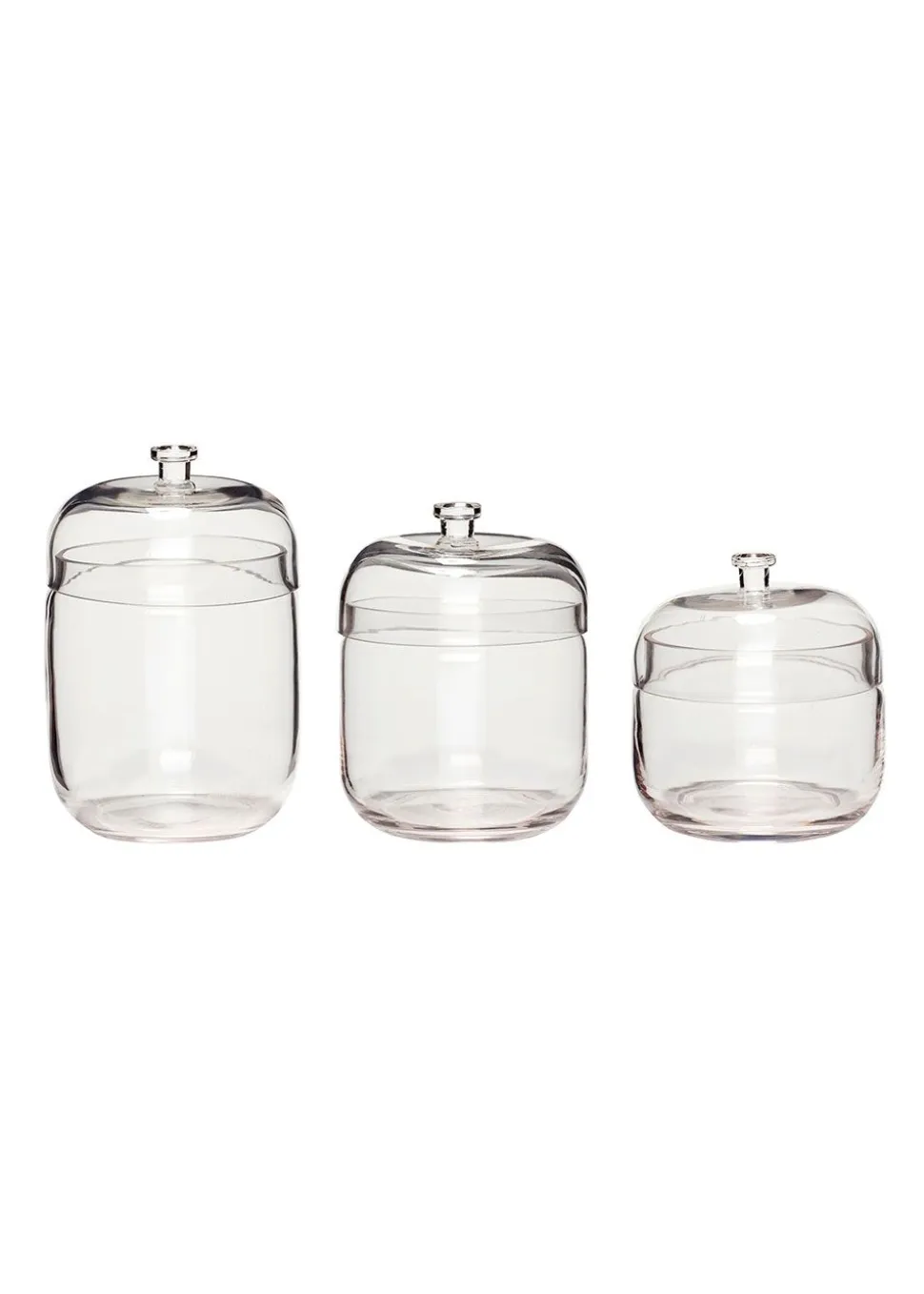 Fill Storage Glass Clear (3er-Set) von ist ein schönes Set aus drei mundgeblasenen Gläsern in verschiedenen Größen, die Schlichtheit und Funktionalität vereinen. Mit ihrem klaren, zeitlosen Design sind sie ideal, um Ihre Kleinigkeiten auf elegante Weise zu organisieren. Die handgefertigten Details verleihen jedem Glas einen einzigartigen Charakter und verleihen Ihrer Einrichtung einen raffinierten Touch.