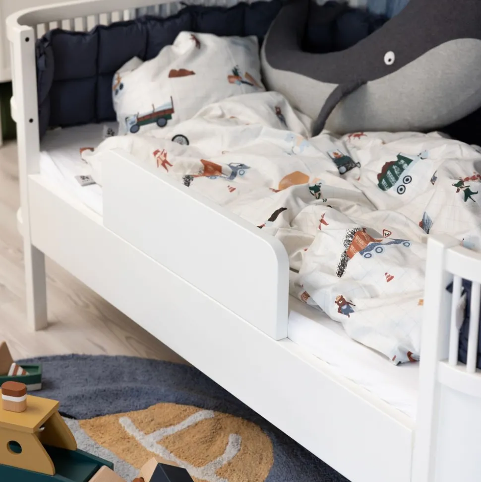Das Bettgitter wird an der Seite des Bettes angebracht – entweder in der Mitte oder am Kopf- oder Fußende. Bei Bedarf kann ein Bettgitter auch an beiden Seiten des Bettes angebracht werden. Hinweis: Beim Bed, Baby & Jr. kann das Bettgitter nicht auf dem Auszug angebracht werden.