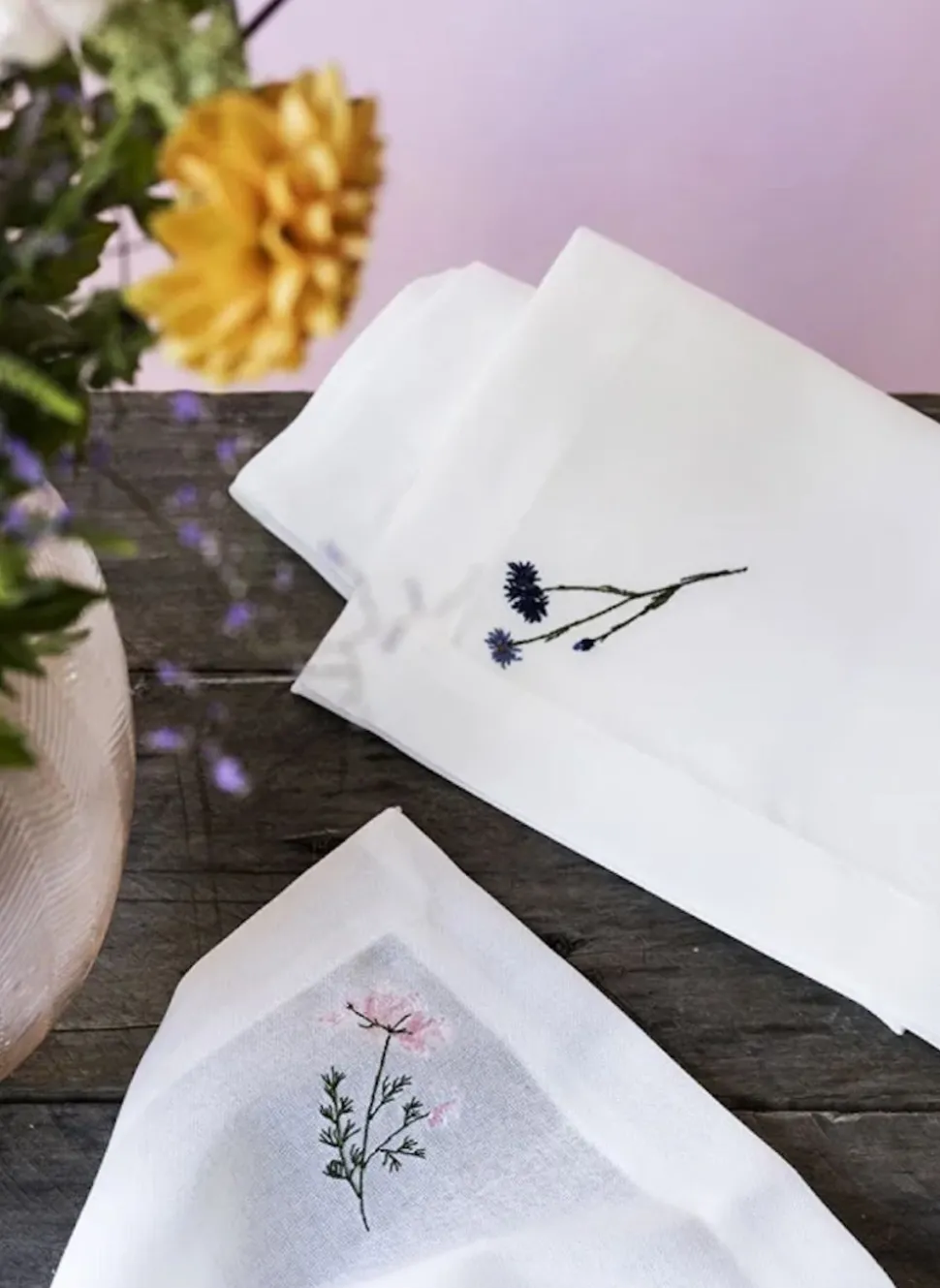 Die schönen FLORA-Servietten von Langkilde & Søn sind mit farbenfrohen Motiven von dänischen Wildblumen fein bestickt. Die Servietten sind vom skandinavischen Sommer inspiriert und tragen zu einer schönen und eleganten Tischgestaltung bei. Durch die feine Größe von 50 x 50 cm können die Servietten auch als Tischsets verwendet werden.