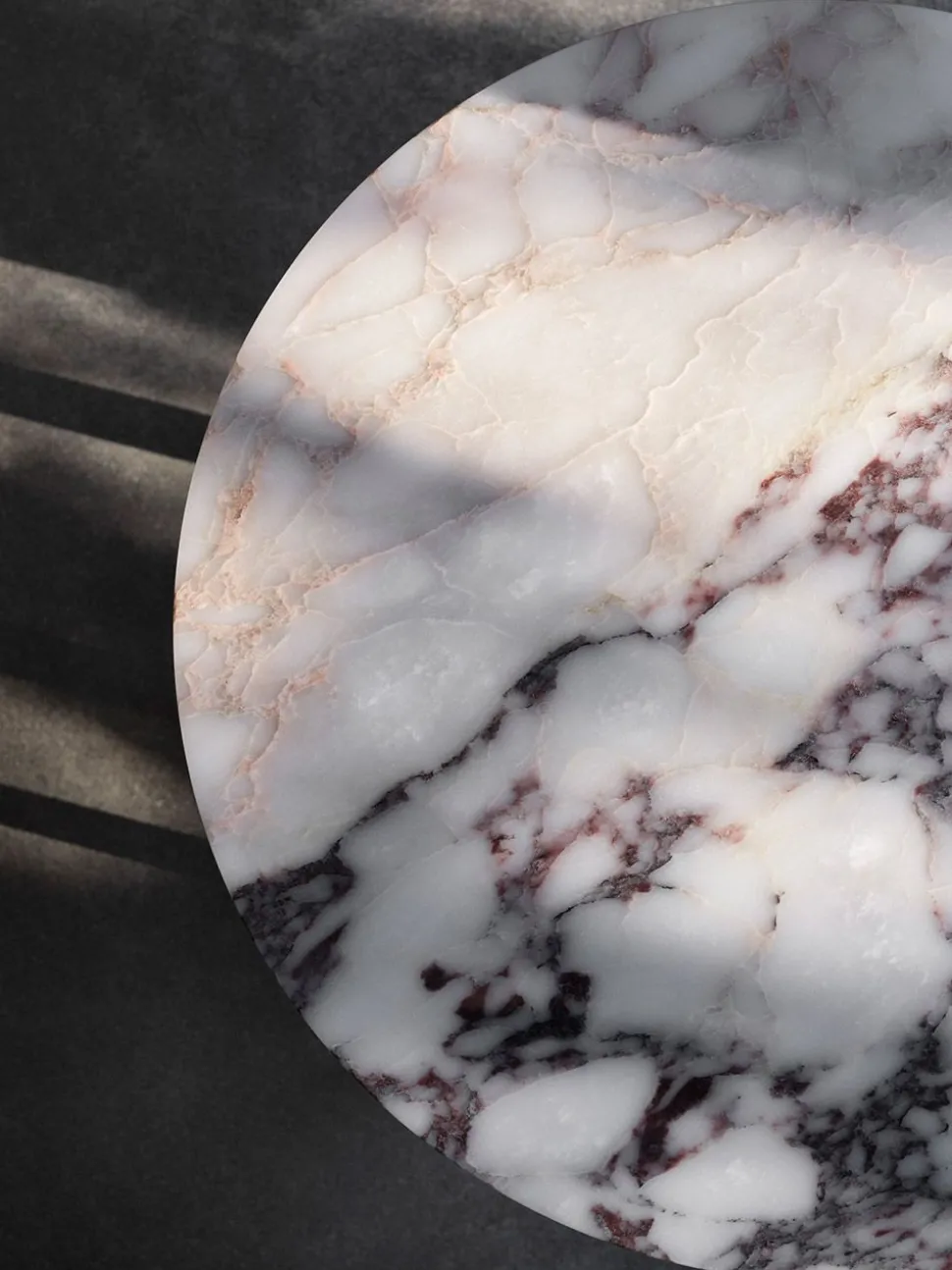 - Material: Untergestell aus pulverbeschichtetem Stahl mit Tischplatte aus Marmor.