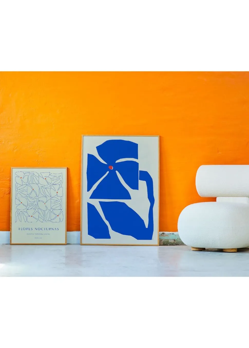 Das Plakat zeigt viele ästhetische Blumen in einem wunderschönen Indigoblau, mit einem kleinen roten Fleck in der Mitte jeder Blume. Die Plakate kombinieren schöne Farbtöne in einer einzigartigen Kombination. Die schönen Schattierungen bringen die kreativen Grundformen zur Geltung.