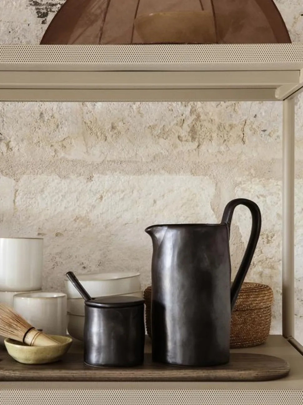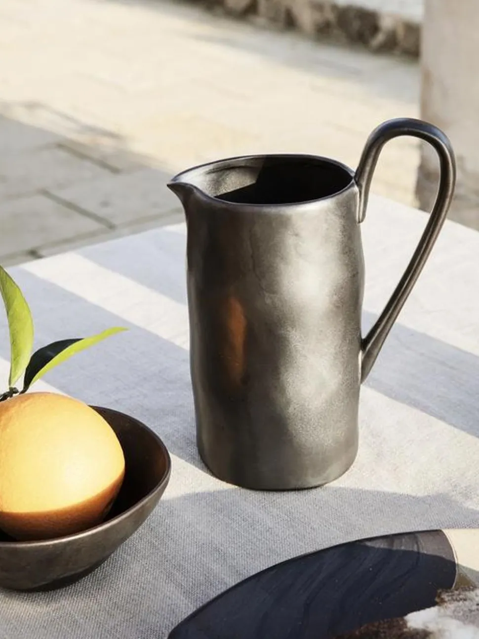 Die schönen Krüge sind mit traditionellen Handwerkstechniken im modernen Stil erstellt. Alle Elemente sind mit einer halbmatten Glasur verziert, um einen einzigartigen Look zu erzielen. Der ansonsten klassische Krug hat einen charakteristischen, länglichen Henkel, der ihn zu einem unverwechselbaren Element auf jedem gedeckten Tisch macht.