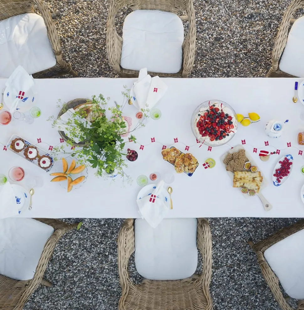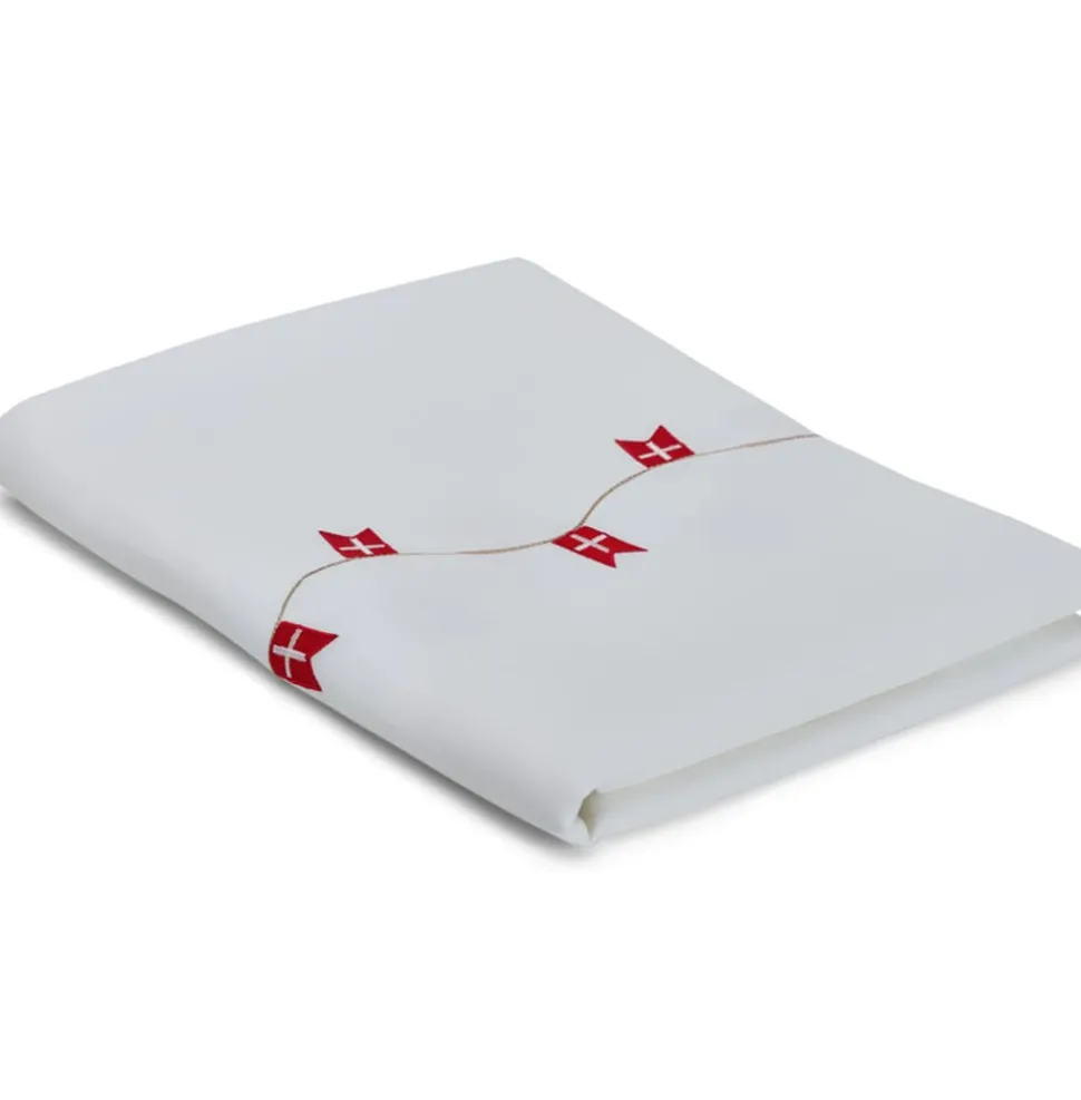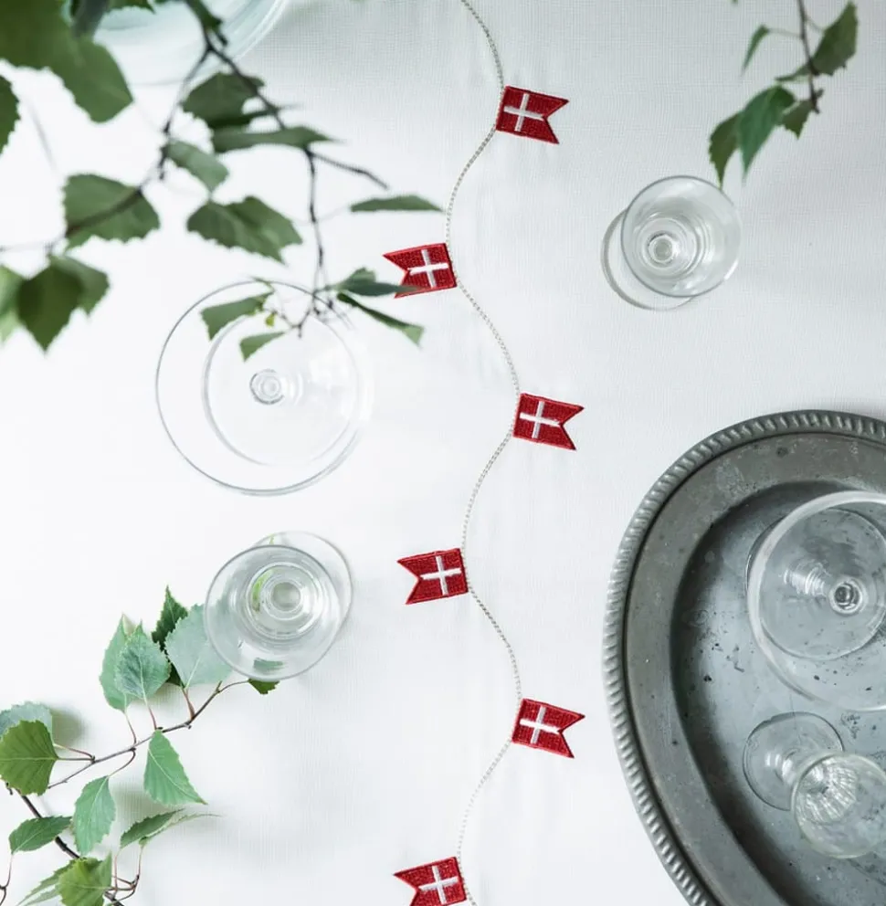 Klassisches weißes Geburtstagstischtuch mit schönen roten gestickten Flaggenschnüren in der Mitte des Tischtuchs. Die Tischdecke ist aus echtem Flaggentuch genäht und wird Generationen überdauern. Das schöne, klassische Design sorgt dafür, dass er nie aus der Mode kommt und dass alle Tischbeläge passen. Die Tischdecke ist Teil der klassischen Nordic Way of Celebration-Serie von Langkilde & Son mit hochwertigen Stofftischdecken und -servietten.