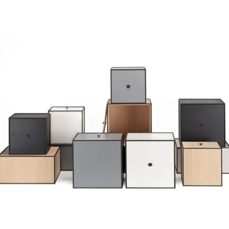 Frame ist eine flexible Aufbewahrungslösung für quadratische Kartons in kubischen Rahmen. Der Rahmen kann direkt an die Wand gehängt, gestapelt oder frei auf dem Boden stehen. Der Deckel kann komplett abgenommen oder als Tür montiert werden. Kombinieren Sie Frame zu einem klassischen Bücherregal, einer einzigartigen Skulptur oder etwas ganz anderem. Die Möglichkeiten sind endlos und Sie können so Ihr ganz persönliches Design und Ihren ganz persönlichen Ausdruck kreieren.