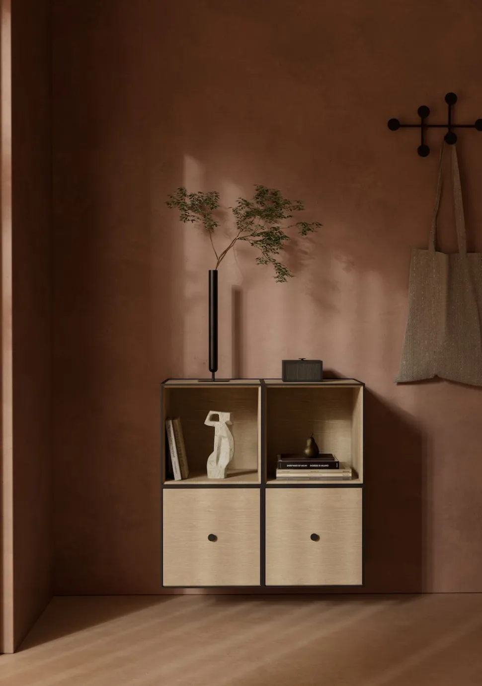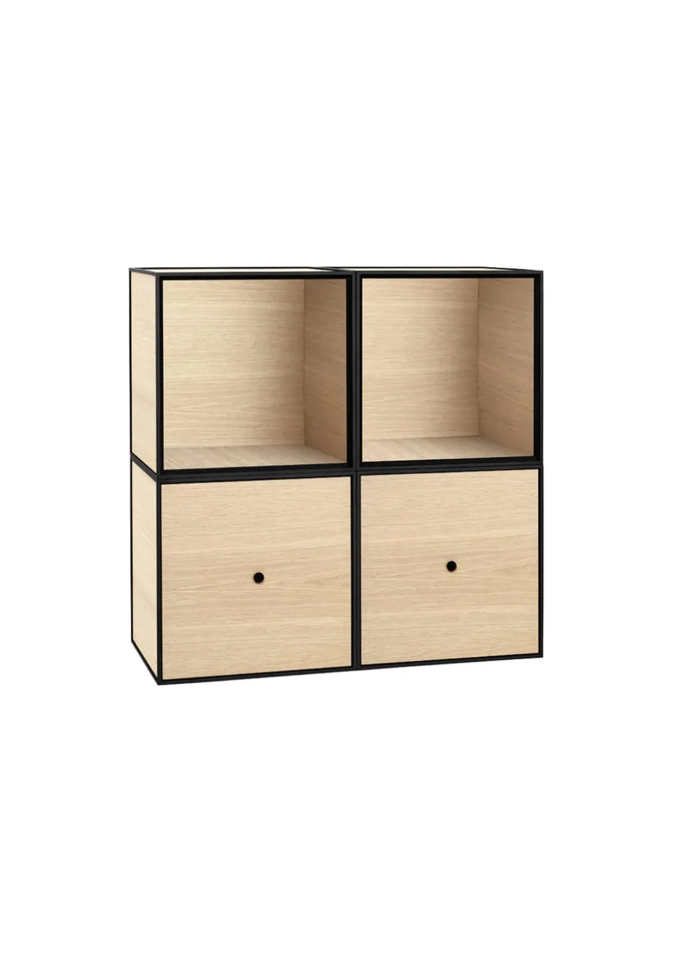 Frame Square Standard ist eine Aufbewahrungslösung, die aus quadratischen Modulen in Rahmen besteht. Das Aufbewahrungssystem ist von Mogens Lassen inspiriert, dessen Mantra war, dass alles zusammenhängen sollte“. Auf diese Weise wird Frieden für das Auge geschaffen. Diese Frame-Variante enthält vier Frame 35-Rahmen, zwei der Module mit Türen. Die gesamte Frame-Kollektion wird in Dänemark in Handarbeit hergestellt und montiert.