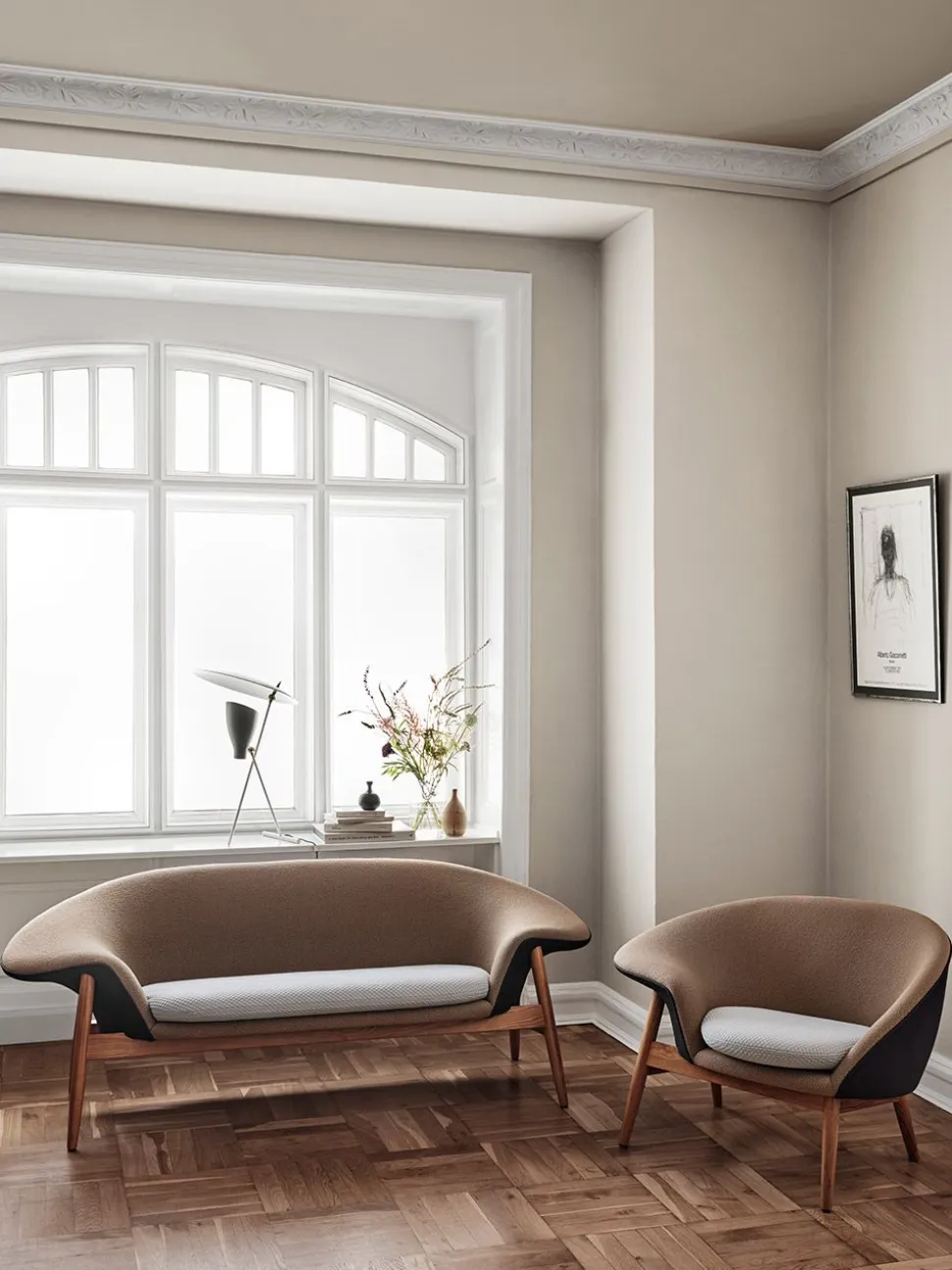 DasSpiegelei ist eines der ikonischsten Möbelstücke von Hans Olsen, ein perfektes Beispiel für einige der Merkmale der dänischen Moderne. Ein asymmetrisches Design mit einer einzigartigen Formensprache, die die Proportionen und den visuellen Ausdruck erforscht. Das Sofa hat seinen Namen von seiner markanten Form, die von oben betrachtet die Konturen eines Spiegels wiedergibt. Das Gestell aus geräucherter Eiche, das dem Design eine einzigartige Tiefe verleiht, wird mit einer breiten Palette an neutralen und kräftigen Farben kombiniert, so dass das Sofa in einer Version erhältlich ist, die zu allen Einrichtungsstilen passt.