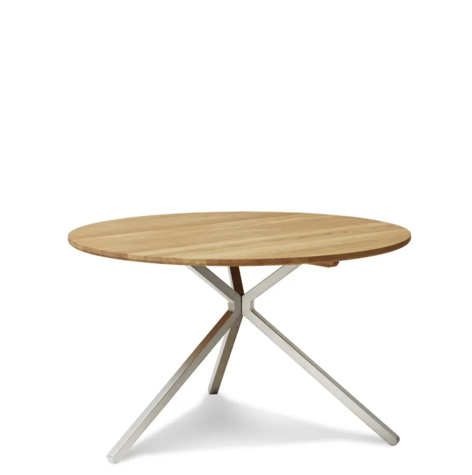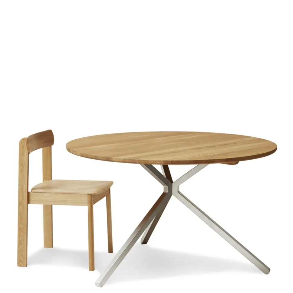 Der Frisbee-Tisch balanciert den Kontrast zwischen dem Schlichten und dem Kraftvollen, zwischen Eleganz und guter Handwerkskunst. Die Tischplatte ist aus Massivholz mit einer feinen abgerundeten Kante gefertigt. Das Knochenmaterial ist starker Rohstahl mit einer speziell beschichteten Oberfläche aus mattem Chrom – ein Ausdruck von Qualität und Anmut. Der runde Tisch lädt zum Dialog ein und es ist immer Platz für einen zusätzlichen Stuhl. Die Konstruktion der drei Beine sperrt die Beinfreiheit nicht ein und macht es einfach, bis zu sieben Stühle um den Tisch zu montieren. Der Frisbee-Esstisch ist für den harten Einsatz und für alle Wünsche gemacht – ob Gastlichkeit, Büro oder privater Gebrauch.