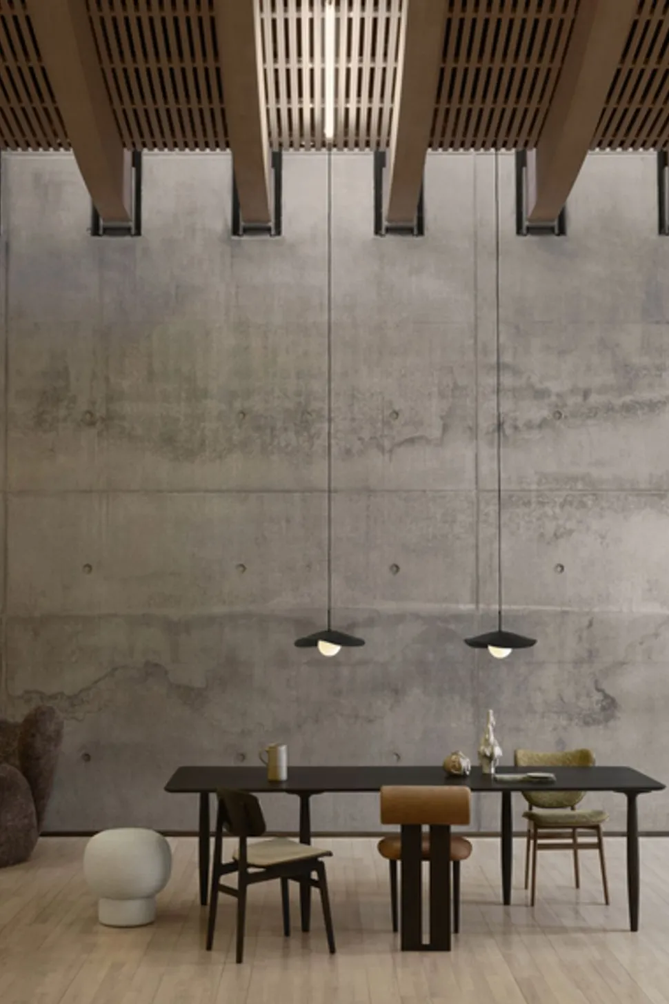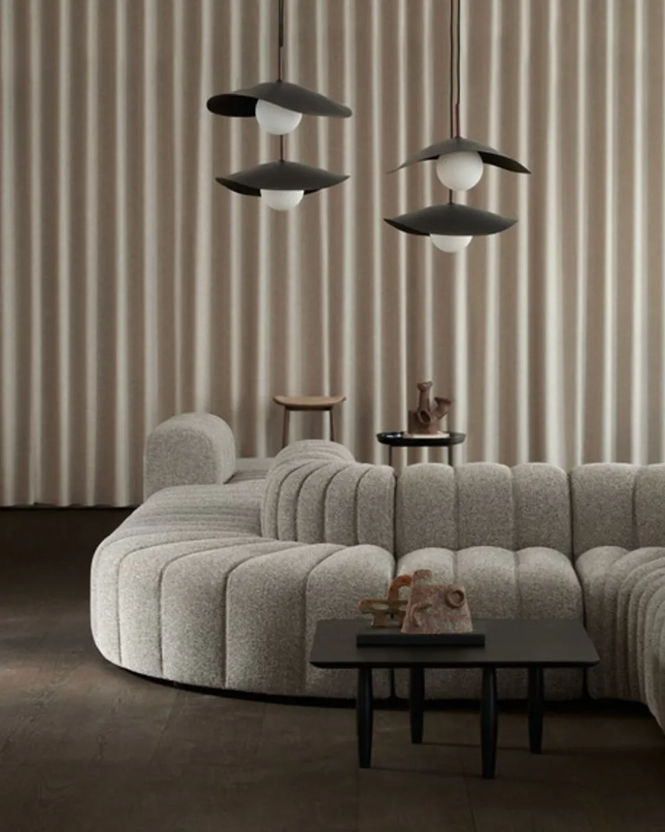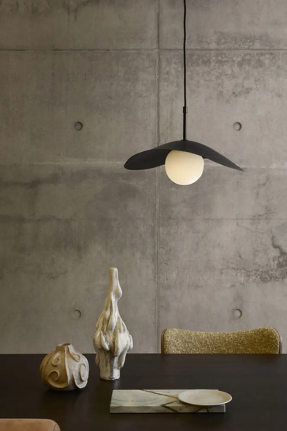 Schöne Lampe, inspiriert vom japanischen Berg Fuji. Der Berg zeichnet sich durch einen ungewöhnlichen symmetrischen Kegel mit flacher Neigung aus. Das sieht man am Fuji-Anhänger, der von der Seite wie ein asymmetrischer Kegel mit einer flachen Neigung aussieht, während er von vorne wie ein ganz normaler Kreis aussieht. Der Lampenschirm kombiniert Opalglas mit weichen, organischen Formen, um ein warmes und durchscheinendes Licht zu erzeugen, das die geschwungene Form der Metallscheibe umarmt. Diese einzigartige Lampe passt in jeden Raum und trägt dazu bei, ein einzigartiges Detail sowie ein gemütliches und natürliches Licht zu schaffen.