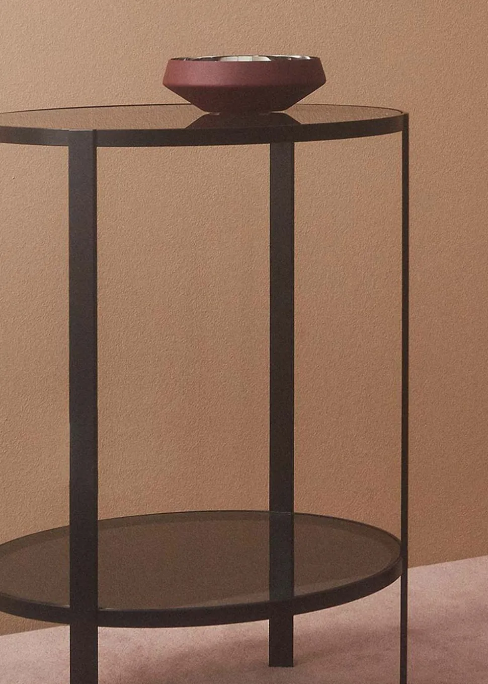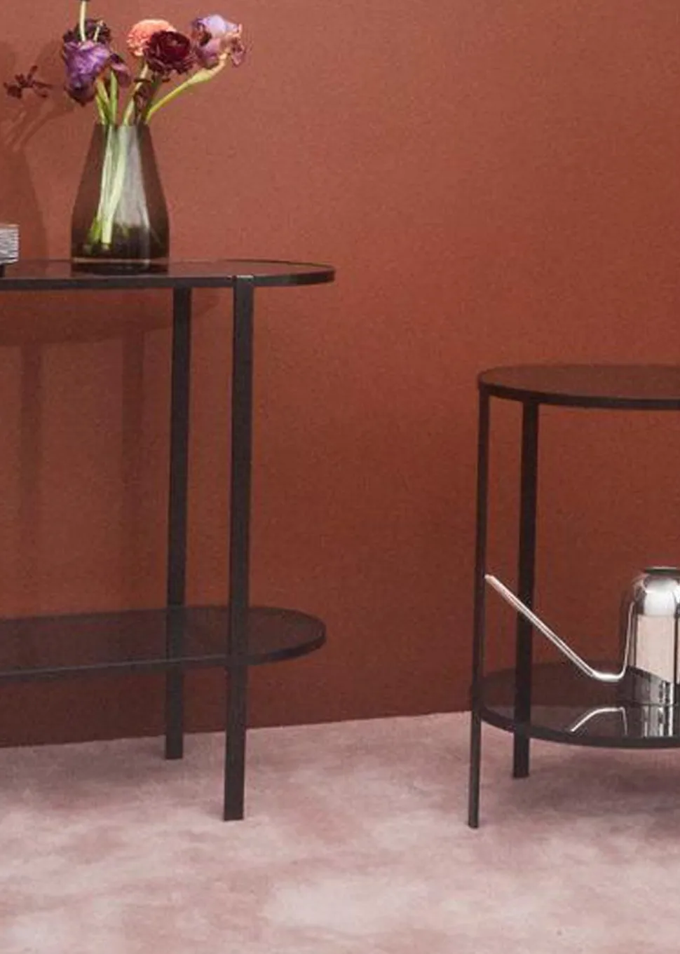 Schlichte und elegante Tische von . Die Tische haben ein nordisches und minimalistisches Design und die schwarzen Glasplatten verleihen einen Hauch von Eleganz, der in jedes Heim passt. Die Tischserie ist in drei verschiedenen Größen erhältlich, alle aus schwarz pulverbeschichtetem Stahl und schwarzem Hartglas.