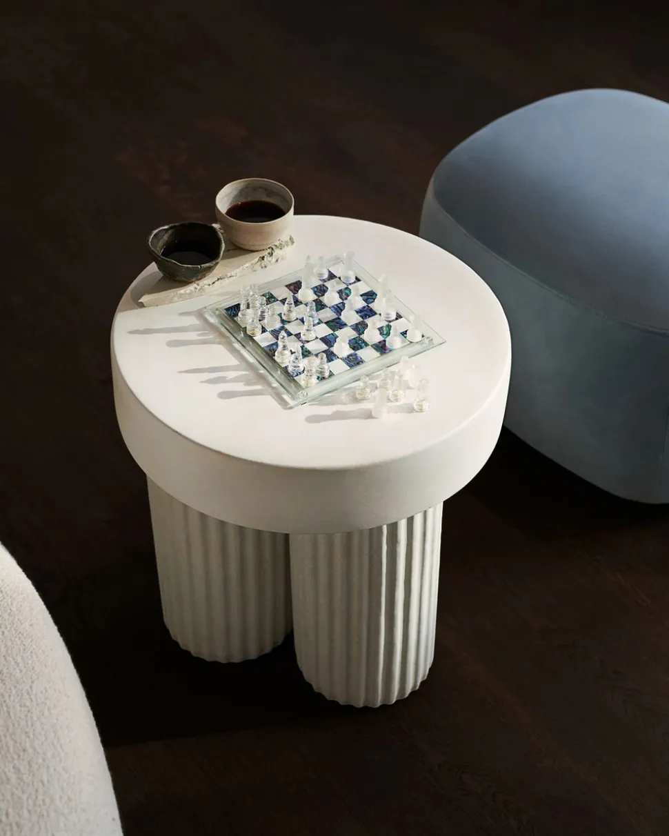 Gear table von Norr11 kann sowohl als Couchtisch als auch als Beistelltisch verwendet werden. Die Serie Gear ist von der brutalistischen Architektur aus der Mitte des 20. Der Tisch ist als blockartige Strukturen gestaltet, die jeweils die schönen architektonischen Bauelemente aus Beton widerspiegeln. Die Tische haben eine runde Tischplatte, die auf drei zylindrischen Beinen ruht. Die Beine haben ein geriffeltes Detail, das dem Design des Tisches eine raffinierte und organische Signatur verleiht. Der Tisch ist aus leichtem Faserbeton gegossen und hat eine einzigartige, fühlbare Oberflächenstruktur.