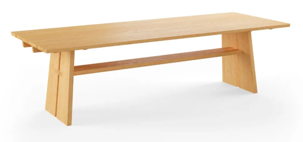 Der Tisch wird von einer massiven Querstrebe getragen und hat ein unverwechselbares Profil, das das robuste und doch raffinierte Design unterstreicht. Sein minimalistisches Design fügt sich wunderbar in moderne Einrichtungen ein, während die warmen Holztöne sowohl zu modernen als auch zu klassischen Interieurs passen.