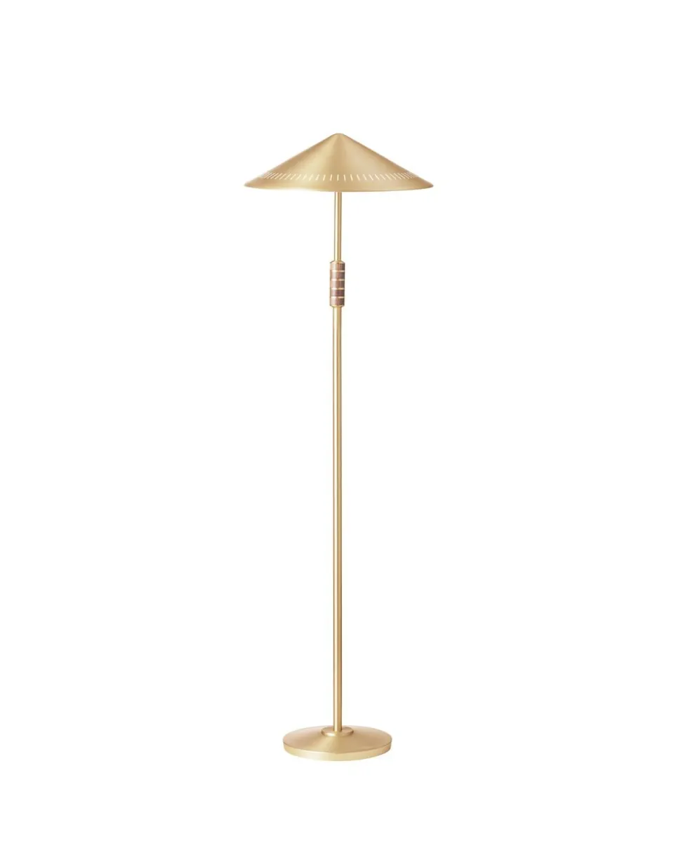 Die Governor-Stehleuchte ist Teil der Governor-Serie von Bent Karlby aus dem Jahr 1956. Eine elegante und raffinierte Lampe aus massivem Messing und Walnuss. Die Leuchte spendet eine schöne, nach unten gerichtete Beleuchtung, während das Licht gleichzeitig angenehm im Messing reflektiert wird. Die Gucklöcher, die am Rand des Schirms angebracht sind, verbreiten ein dekoratives Lichtmuster im Raum.