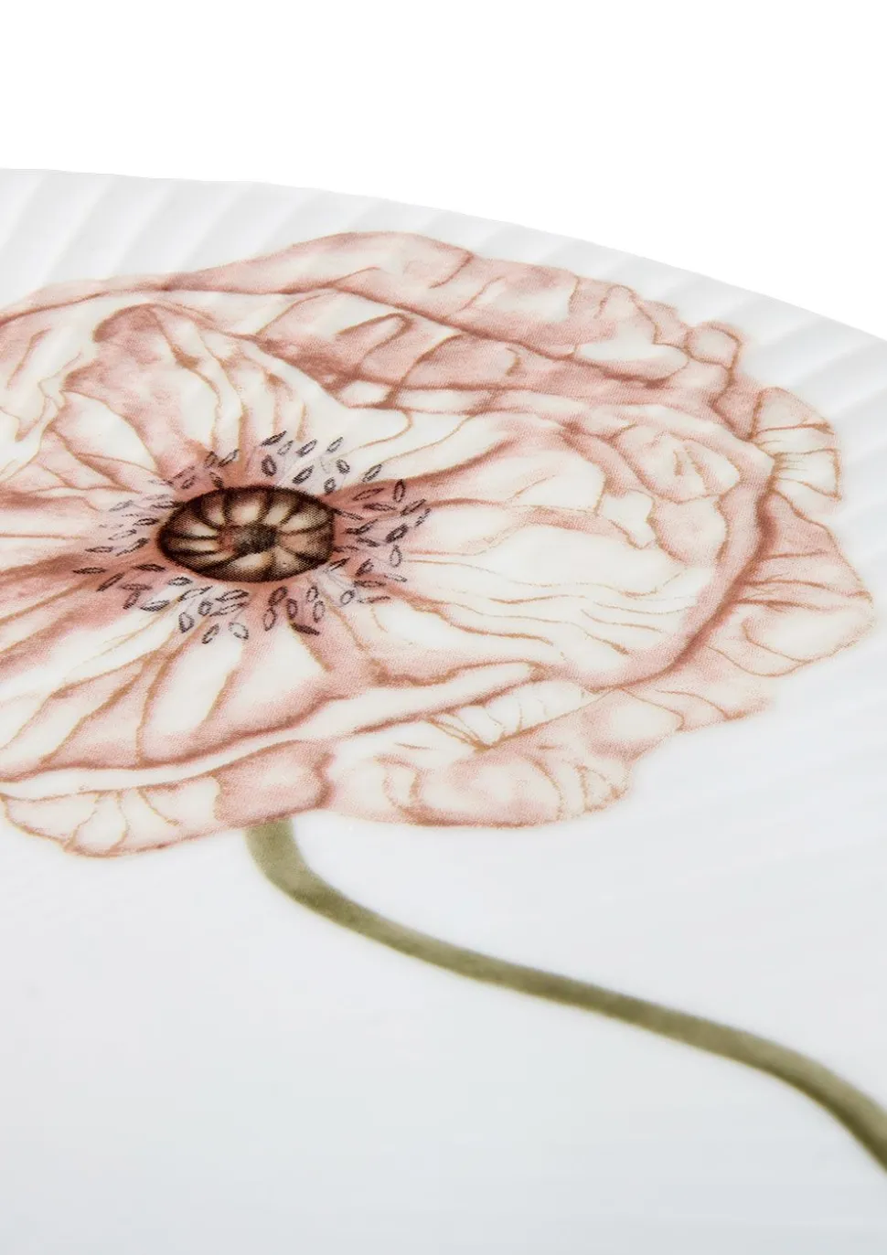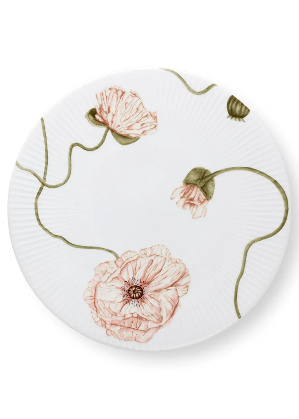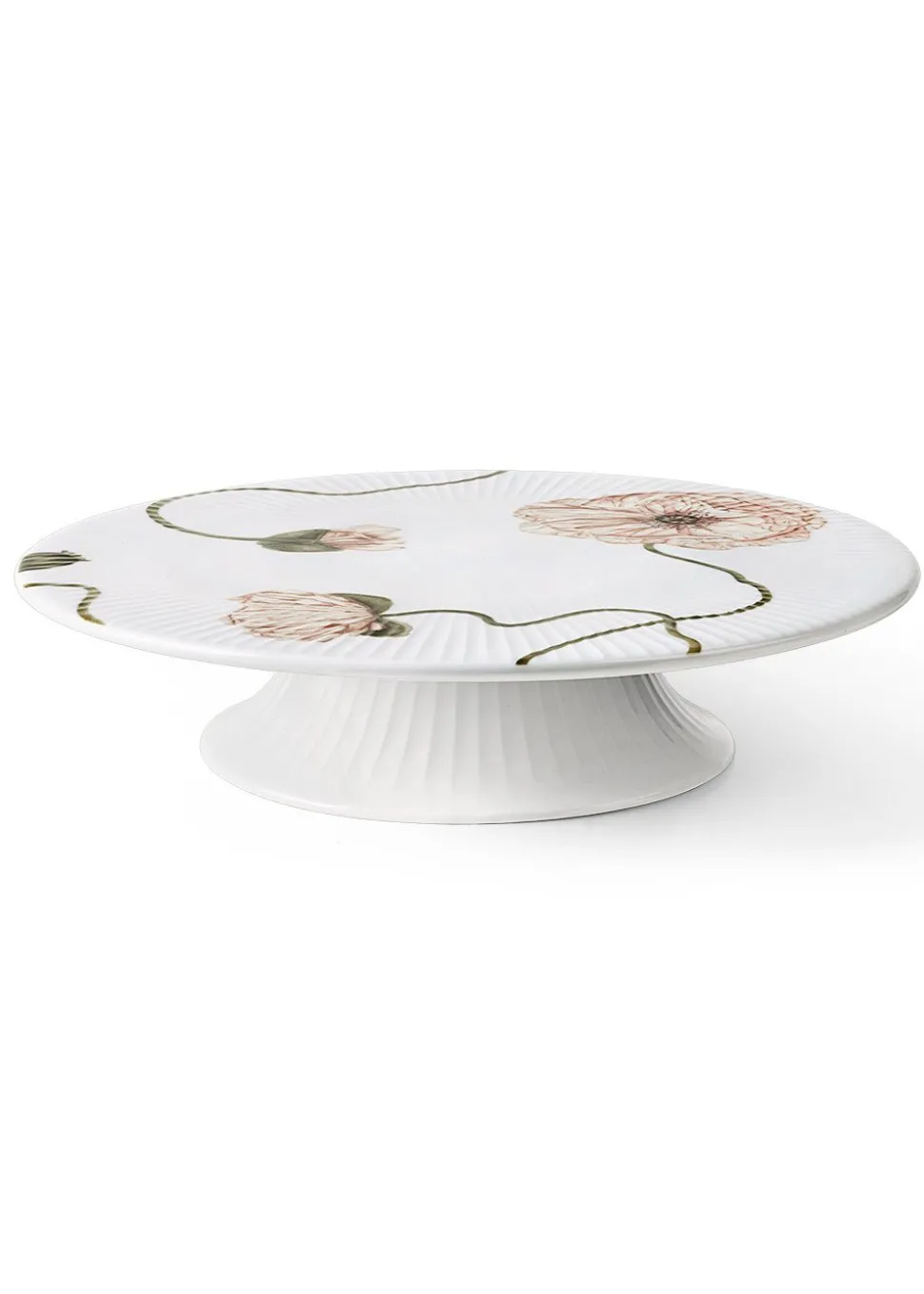 Die schöne Hammershøi Poppy Cake Dish von wurde von Hans-Christian Bauer & Rikke Jacobsen entworfen. Die Kuchenschale ist eine schöne und elegante Porzellanschale in weißer Farbe mit zarten Mohndekorationen. Die runde Form, die Rillen und die weichen Kurven verleihen der Schale eine organische und feminine Ausstrahlung, während die Mohndekoration ein schönes und elegantes Detail darstellt.