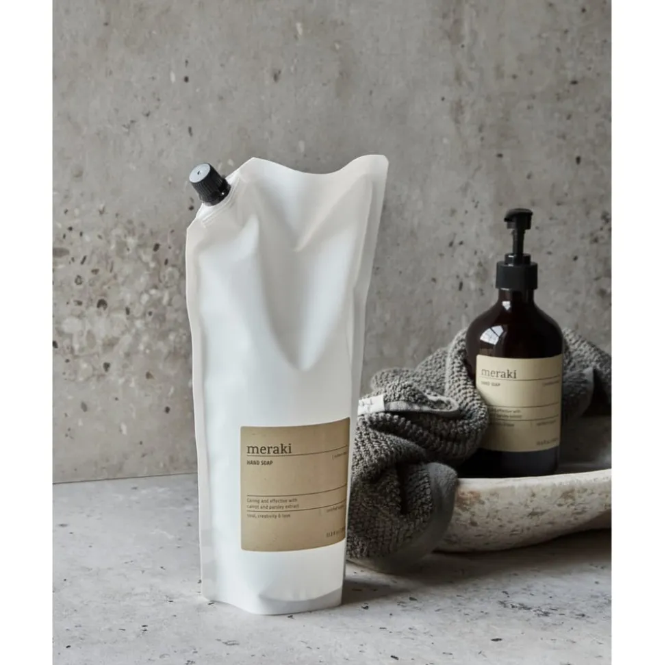 Der praktische 1-Liter-Nachfüllbeutel aus recycelbarem Kunststoff macht es einfach, Ihre leere Meraki-Flasche zweimal nachzufüllen und so den Verpackungsmüll zu reduzieren. Stellen Sie die Seife für den täglichen Gebrauch neben das Waschbecken und kombinieren Sie sie mit der Handlotion für eine komplette Pflegeroutine.