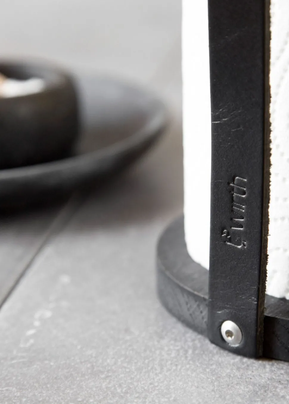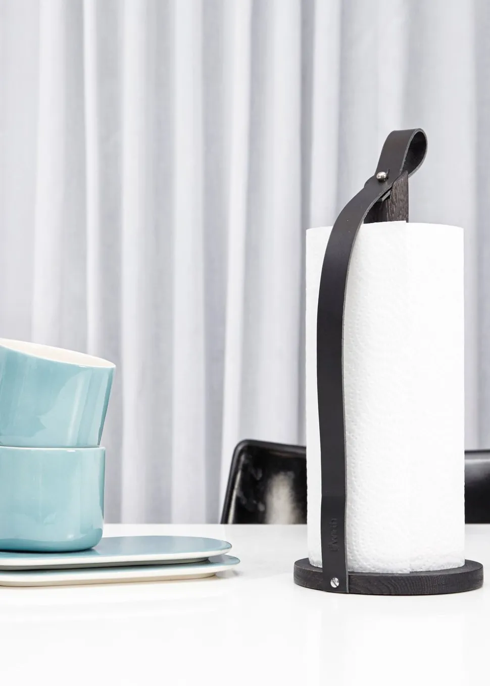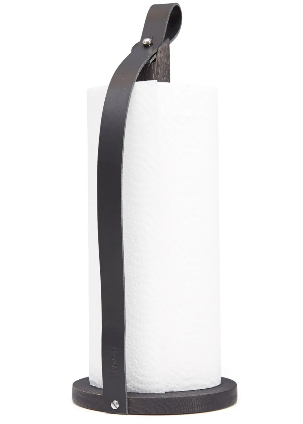 Hands On ist ein Küchenrollenhalter von . Der Halter ist aus massivem Eichenholz mit schöner sichtbarer Maserung gefertigt. Das angebrachte Kernlederband hält das Papierhandtuch an Ort und Stelle und kann auch verwendet werden, um den Halter herum zu tragen.