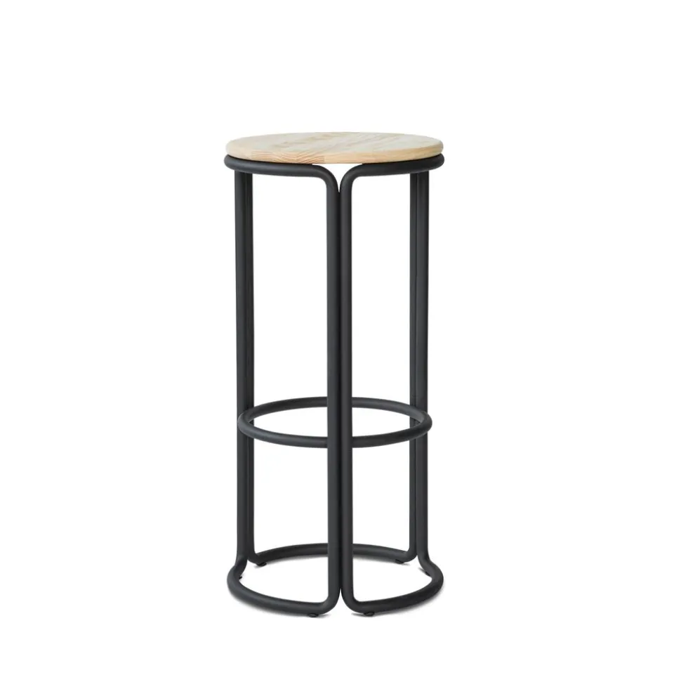 Der Barhocker Hardie von , entworfen von Philippe Malouin, ist der Inbegriff von klarem, funktionellem Design. Dieser Barhocker verfügt über eine klassische runde Sitzfläche, die von drei gebogenen Metallrohrsäulen getragen wird, die Schlichtheit mit robuster Haltbarkeit verbinden. Malouins Design sorgt dafür, dass die Säulen so miteinander verbunden sind, dass sie eine starre, stabile und langlebige Struktur bilden, die den Hardie Barhocker sowohl praktisch als auch ästhetisch ansprechend macht.
